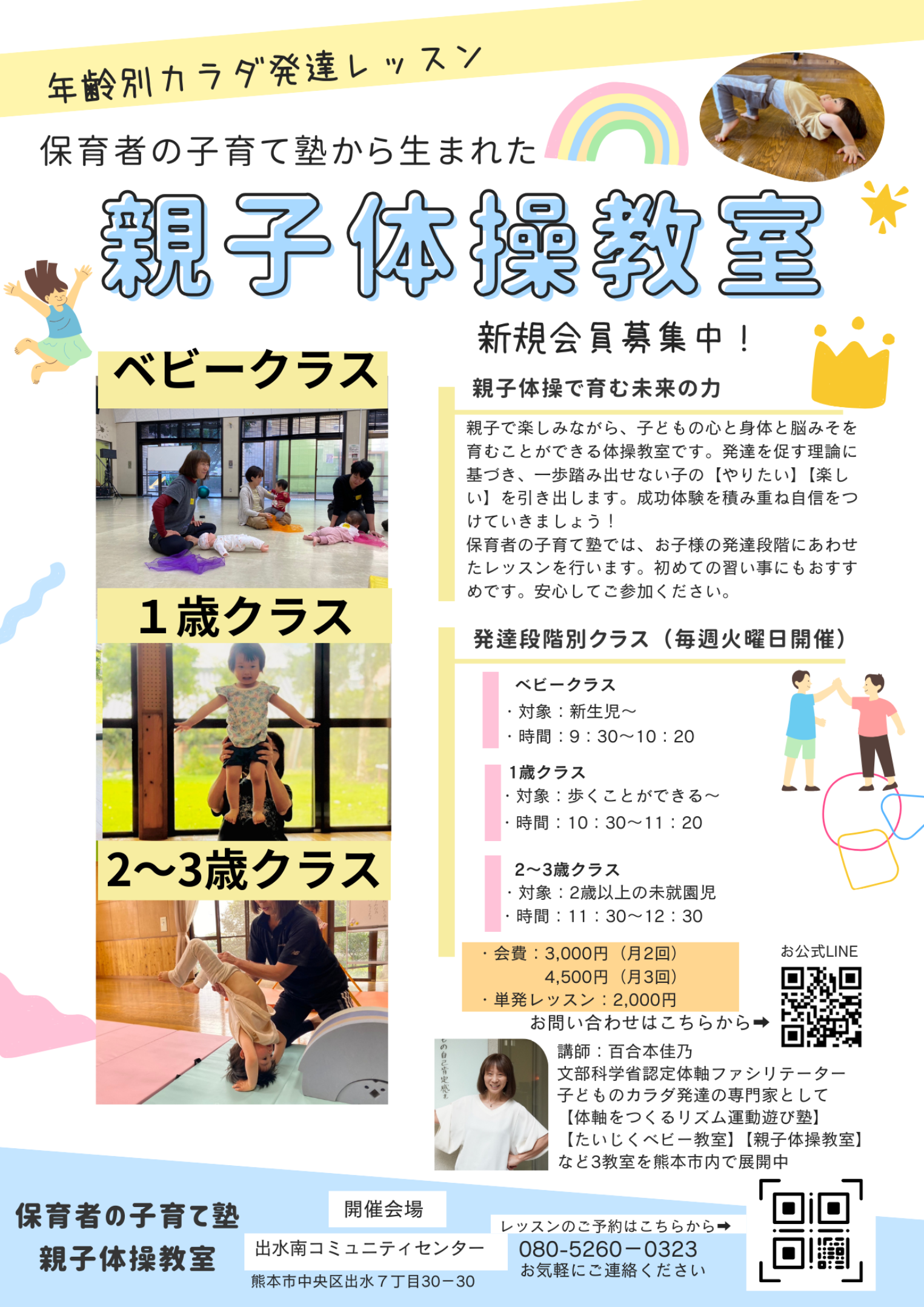 みなさん こんにちは! 保育者の子育て塾から、親子体操教室が生まれました! 一歩踏み出せない子が、『やりたい』というようになる。 成功体験を繰り返し自信をつける。 年齢別カラダ発達レッスンを一緒に始めませんか? 私はこれまで3年半、毎月1回『0歳からの体軸セラピーとリズム運動遊び』を公民館で開催しています。 ここでは、0歳~就園前の子どもたち中心に、時には兄姉も参加するカタチで、マッサージや異年齢の運動遊びやリズムをしているのは、皆さんもご存じのとおりです。 毎回、発達段階の違う子どもたちと関わる中で、異年齢の良さもあるけれど、もう少し丁寧に発達の道すじに添ったカラダ発達を深められないだろうか... 子どもたちの発達段階を確実に保障していくにはどうしたら良いだろうか...そんな思いが溢れ出るようになりました。 そんな中で、1年前に生まれたのが、『体軸を育てるリズム運動遊び塾』です。 ここでは、3歳以上の子どもたちが、毎週1回、幼稚園が終わった後の習い事として、リズム遊びを中心に、『体軸体操』や『体育遊び』など、たっぷり2時間の運動に取り組み、見る見るうちに、運動能力をアップさせていきました。 そして、今回、毎週1回の『親子体操教室』では、0歳~3歳の発達段階別クラスをつくり、一番大切な3歳までの身体の土台つくりに取り組むことにしました。 子どものカラダ発達の土台作りは、発達の道すじに添って進んでいきます。 特に0歳~3歳までは大切なカラダ作りの3年間です。 幼い子どもこそ、発達段階にあった『うんどう遊び』に楽しくとりくむことで、運動能力の土台ができるのです。 これは、保育者の子育て塾でも、人気NO.1の【巴投げ】 やり始めると『もう一回やって』が止まらない...(笑) 子どもたちの大好きな回転遊びで、回転感覚を養います。 三半規管や、脳の活性化にもつながります。さらに、体幹の使い方がわかるので、逆さが大好きになってバランス感覚が良くなります。 この巴投げには、予想以上の効果があり、怪我をしにくくなる。転びにくくなる。 さらに、運動への意欲が向上するから、『もっとやりたい』が口癖になります。 保育者の子育て塾では、赤ちゃんもいれば、1歳児、2歳児、3歳児もいる。 はじめて、『やってみて』と見本をみせられたお母さんたちは、心臓バクバクだったことでしょう... 同じ『回転する遊び』なのですが、発達段階によって、課題は違います。 【巴投げ】は、奥が深くて、ただ投げるだけではないのです。 例えば2歳児であれば、逆さになった時には、しがみつきに挑戦させるのです。 0歳児であれば、膝の上でしっかりと背中を弓なりに伸ばし、体軸ポイントを刺激しながら、首を柔らかくして前回りを促します。 この回転遊びが、マットの前回りの導入として、また、鉄棒の逆上がりにつながるんです。 年齢別カラダ発達レッスンでは、課題を明確にしながら、子どもたちの『やりたい』を引き出していきます。 年中・年長になった時に、鉄棒や跳び箱を練習するのではなく 3歳までの運動遊びによって、できる土台をつくっておくのです。 乳幼児期のスポーツでは、まず3歳までの土台つくり/カラダつくりが中心です。 しかも、幼いうちから運動はやった方がいいのです。幼いうちから運動神経を育てないと、ドーパミンも出にくいし そうなると脳の働きが鈍くなる。 運動をすると、ドーパミンがたくさん出ますが、そのドーパミンが脳の働きを活性化させるのです。 運動神経も脳が大いに関係ありますから、運動ができる=脳がかしこくなるとの認識でOKです。 つまり、運動をすると頭が良くなります。 乳幼児教育に重要な、『クリティカルエイジ』ってご存じですか? 脳が最も効率よく学習する期間に、やっておかなければならないことはやっておくことです。 乳幼児期は、脳が最も発達する年齢なので、ありとあらゆる可能性のことをやっておくのです。 0歳から3歳までは、運動能力の基礎トレーニングの期間なので、カラダを使った動作を脳に覚えさせるだけで、 成長してからの運動能力の向上が大変スムーズになります。 それが発達段階に合わせた運動遊びなんです。 【親子体操教室】では、年齢別クラスを3つにわけて、乳幼児期のカラダ発達保障をしていきます。 1時間目:0歳児クラス(新生児~歩かないお子さん) 2時間目:1歳児クラス/2歳児クラス(就園してないお子さんまで) さあ!お父さんお母さんも一緒に楽しんで お子さんの《カラダの正しい使い方》 《カラダ本来の力》を育てませんか? ◆講師プロフィール はじめまして 文部科学省認定 【体軸ファシリテーター】 【体軸ベビー講師】【体軸療育士】【体軸骨盤ケア認定士】の 百合本佳乃です。 私は、もと保育者。 保育現場を離れてから、非営利活動の【保育者の子育て塾】を立ち上げました。 これまで約4年間、約4000名の親子の皆さんが【保育者の子育て塾】に参加をしてくれました。 この《保育者の子育て塾》か
