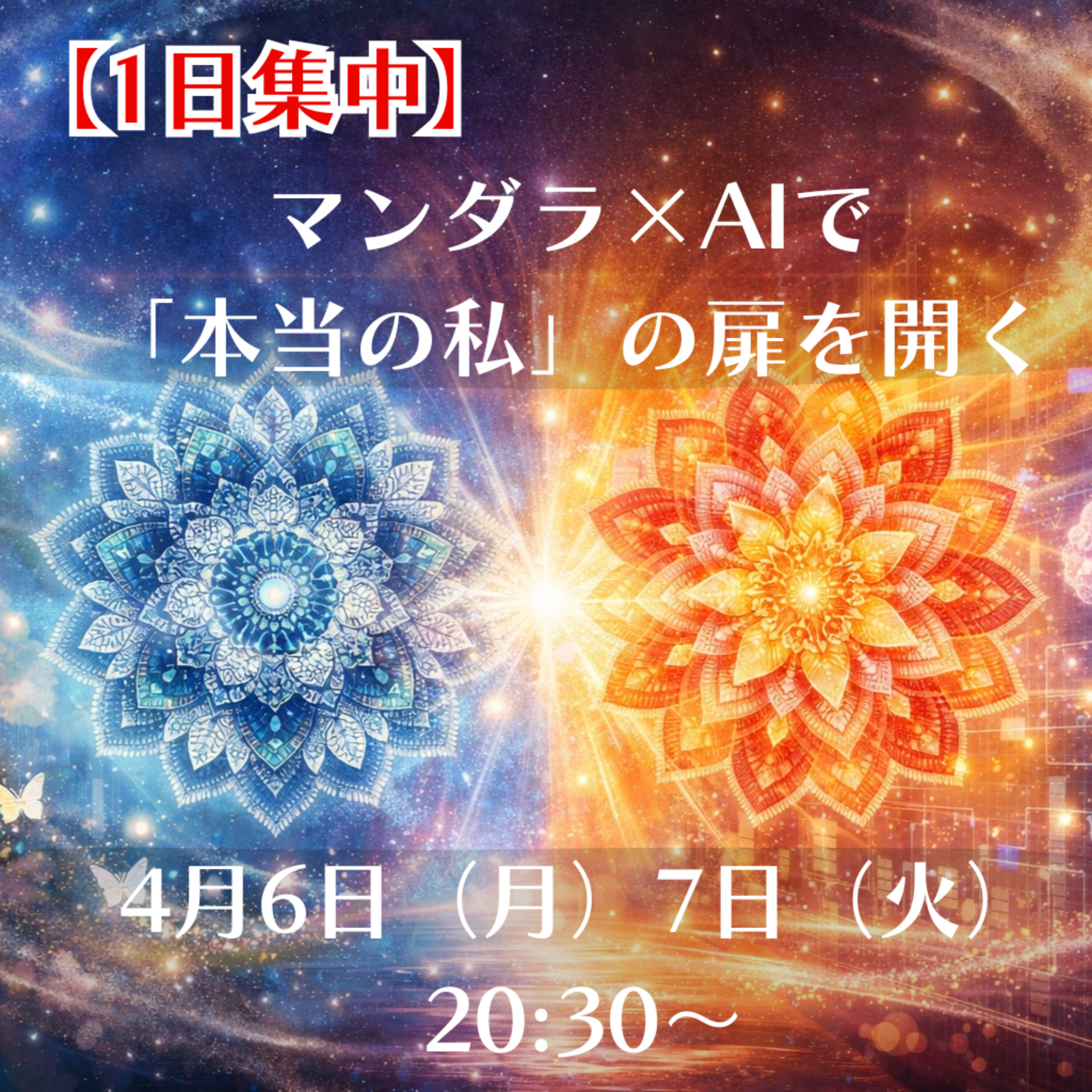 【1日集中】マンダラ×AIで「本当の私」の扉を開く 「私の人生、このままでいいのかな?」 「でも、本当にやりたいことが何かわからない……」 そんな想いを抱えているあなたへ。 これまで頑張ってきた自分を、見つめて認めて 一度心から抱きしめてあげませんか? 最新の「AI」と、古来より伝わる「マンダラ」を融合させ、 あなたの心の奥底に眠る「潜在意識」を鮮やかに描き出します。 直感で選んだマンダラアートに導かれて 自分と本音で繋がると、不思議なほど自信が湧き、 「新しいことに挑戦してみたい!」という新たな勇気が戻ってきます。 まずはその一歩を、この1日集中セミナーで体験してみませんか? ◉ マンダラ×AI 潜在意識体験セミナー ・日時:4月6日(月)、7日(火) いずれも20:30〜22:00 ・費用:無料 ・場所:Zoom あなたの「本音」は、未来を照らす一番の光です。 一緒に、新しい自分に出会いに行きましょう。