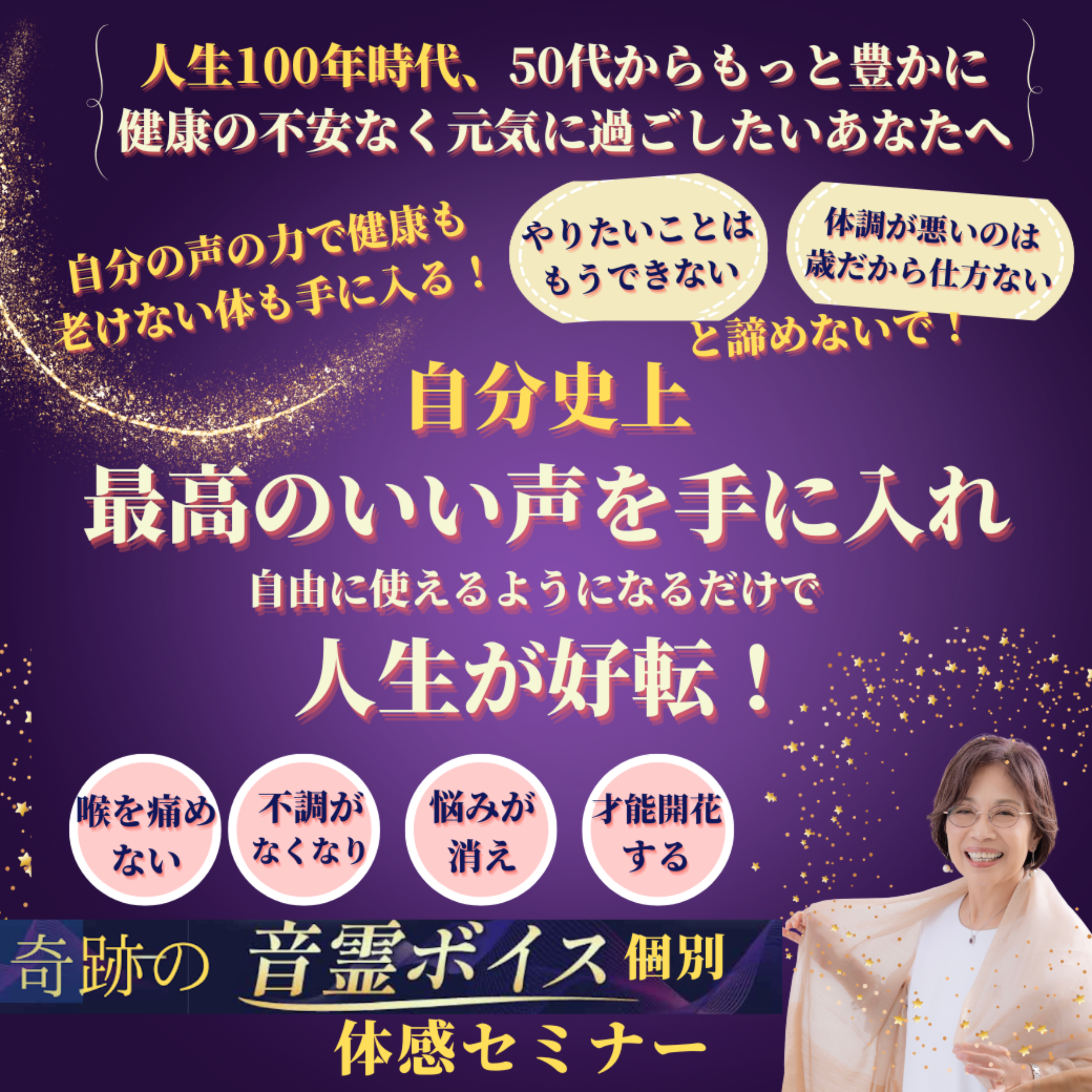 お申し込み ありがとうございます! ★。*・。*・。*・。*・。★。*・。*・。*・。*・。*★。*・。*・。*・。*・。*★。 自分史上最高のいい声を手に入れ、人生が好転! 音霊ボイス体感セミナー ★。*・。*・。*・。*・。*★。*・。*・。*・。*・。*★。*・。*・。*・。*・。*★。 人生100年時代、50代からもっと豊かに 健康の不安なく元気に過ごしたいあなたへ 音霊ボイス体感セミナーでは まだ日本ではあまり知られていない 秘密のスキルをお伝えしようと思います^^ 今回限り 12人限定2025最後のプレゼント企画で 5500円のところ無料でご招待いたします! 誰もが持っているのに知られていない 魔法のような力を 上手に使えたらいいと思いませんか? 実は、この力で 生きるエネルギーを最大限に高め 粒子レベルで細胞をパワフルに変化させ チャクラを調整し、免疫力を高め 医者いらずの心とカラダが手に入るのです!! 心とカラダが調整できると、どんどん開運体質になり 仕事もプライベートも、幸運を引き寄せることができるようになりますね! この力が あなたの声! 音霊ボイスの不思議な力。 あなたの声に秘められた この音霊ボイスの力を使うことで 心もカラダも自分で調整できるようになります。 体感セミナーでは、簡単な体を緩める体操をして 実際に声を出していただき ご自分の音霊ボイスの使い方を体感していただけます。 オンラインで体感いただけますので 少しの時間、立って体を動かす空間と 大きな声が出せる環境をご用意ください。 体感セミナーにご参加することで、あなたは、、、 ✅ 案外知らない自分の体の若返りの秘密が体感できる ✅ 更年期でも、医者いらずの心と身体が手に入る秘密がわかる ✅ 粒子レベルで細胞をパワフルに変化させる自分の”音霊ボイス”がわかる ✅ ビジネスもプライベートもどんどん幸運を引き寄せてしまう秘密がわかる ✅ 人生100年時代、介護いらず病知らずで元気に最後まで生きる方法がわかる ✅ 音霊ボイスを使って心身を整える方法がわかるので、先々の体調の不安がなくなる ✅ 声の悩みが一気に解決する目処が立つ(声が小さい、低い、通らない、聞きづらいなど) 古来日本に伝わる 言霊と対にあった音霊の力。 それは アメリカやヨーロッパでは 西洋医学に限界を感じたお医者様が 東洋医学の学びと共に治療の一環に使っている サウンドヒーリングの世界 今回の体感セミナーは そのほんの一部を体感していただきます。 誰でも歳を取れば老けるものと思っていませんか? 体調が悪いのは更年期だから仕方ないと思っていませんか? 違います!! 科学的に解明されている 誰でもできる”たった2つのこと” ”声と体を老けない使い方”に変えるだけで 心も体も自分で調整できて 悩みが消え、不調がなくなり、人生好転、才能開花して 自分の声の力で思い描く理想の人生が手に入ります! ◆ こんなお悩みやご希望はありませんか? ✅ 最近老けてきたような気がする ✅ 最近体を動かすのがひどく億劫になってきた ✅ もっと自信を持って自分の才能を開花させたい ✅ 時間が自由になるオンラインの仕事がしてみたい ✅ 仕事もプライベートもなんだかやる気が出てこない ✅ 最近更年期に突入したのか、体も心もモヤモヤして調子が良くない ✅ まだまだ元気で仕事をバリバリ続けたいけれど、先々が不安になってきた 、、など こんなお悩みには 音霊ボイスがお役に立てます。 あまり知られていないのですが 自分の声は自分に 最高の癒やしをもたらします。 声の周波数が脳に働きかけ 神経伝達ホルモンを活性化させ 脳の周波数を変えていきます。 ですから 心の状態も身体の状態も 自分の声の振動で調整できてしまうのです。 セミナーではその声の使い方が体感できます。 ◆講師プロフィール 音霊ボイスセラピスト 田所雅子です。 ストーリーテラーとして38年 幼児から認知症のお年寄りまで あらゆる年齢層の方々に物語をお届けしてきました。 人の心に響くストーリー それを届けるのに使う 声の研究を続けてきました。 その中で 声の力と体の使い方に気づき その理論を自分自身に実践して 効果を実感してきました。 また 独自に編み出した マザーボイス子育メソッドを伝授して 子育て上手なお母さんになっていただきました。 20年で5000人ほどの 生きづらさなどのお悩み、子育てのお悩みを「声で」解決してきました。 詳しくは著書 『こどもを育むまぁるい声 マザーボイス』 をご覧ください。 現在は おとだま合同会社 NPO法人伊豆こどもミュージアム 以上 2つの法人を運営しています。 人生100年の時代 子育てが終わっても 最後まで笑顔で元気に楽しく 好きなことをして生きていかれるように これまでの私の人生の集大成の 内容を盛り込み 音霊ボイスの力をお伝えする 「音霊ボイス養成講座」を 新たな事業として企画構築いたしました。 まずは 体感セミナーであなたの音霊ボイスを体感してみてください。 2022年の夏 私自身が自分を整えたこの音霊ボイスの