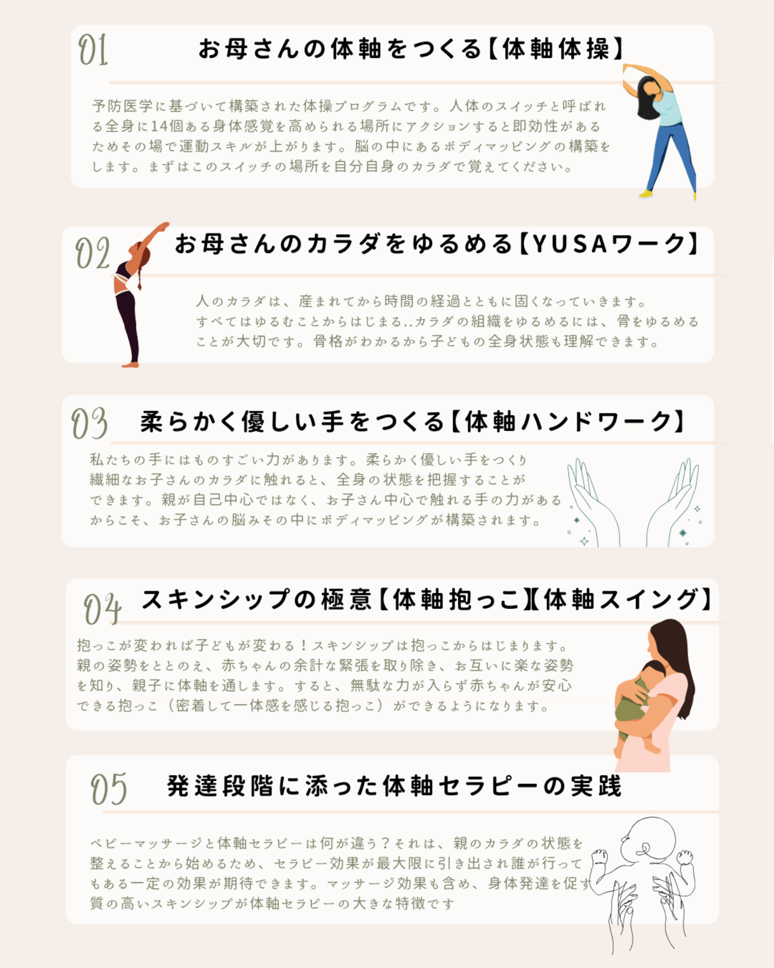 お子さんは大丈夫? 『姿勢の悪い子どもが増えている...』 私は、長いこと保育現場で子どもの発達を見つめてきました。 そして今、子どもたちのカラダを見ていて、保育者の立場から気になることがいくつかあります。 それは、姿勢の悪い子どもが多すぎるという事実です。 子どもたちの姿勢の悪さは、かなり以前から指摘をされています。 この姿勢の悪さが、子どもの発達全体に与える影響について心配する声は上がっていますが、具体的にどのように改善したらよいかご存じでしょうか? 新生児から始める【体軸セラピー】は... 体軸理論に基づいた運動理論をもとに構築された 新生児~乳幼児の身体発達をうながす画期的なセラピー手法です! 今回は、皆さんに【たいじくベビー教室】について興味を持っていただき 子どものカラダ発達の土台作りについて、一緒に考えていただきたいと思います。 新生児には、産まれた瞬間から《重力》という環境に適応していく発達(反応)が備わっています。 この重力下における発達を充実させつつ、次の発達を自然と促していくのが【体軸セラピー】です。 身体を動かす機会が少なくなっている現代...そのため子どもたちの身体能力は著しく損なわれています。 その一方で、社会や親から期待される結果(能力)は高く、 そんな子どもを取り巻くジレンマを乗り越えるためのサポートが【体軸】です。 脳の機能が解明され、脳が身体をコントロールしている事実は、科学的に明らかになりました。 『子どもの運動能力を伸ばしたい』...現代の親たちのわが子に対する期待は大きく...だからでしょうか... 幼児期からサッカーや水泳、野球や体操教室に通う子どもたちのなんと多いこと... しかし、お子さんのカラダ(姿勢)そのものが歪んでいたり、 せっかくの習い事である運動そのものが、歪(いびつ)な運動だとしたら、 子どものカラダに癖をつくってしまい、パフォーマンスは向上しません。 身体が上手く使えるからこそ、パフォーマンスは発揮されるのです。 パフォーマンスは、筋力だけではすぐに限界を迎えます。 大事なのは、カラダの使い方。これに集約されます。 子どもの個性(能力)を最大化していくための基盤が【体軸】です。 まずは、【体軸】について語らせてください。 【体軸】とは、読んで字のごとく、身体を上下に貫く軸のことです。 身体を動かしていくうえで、最重要とされる【身体感覚】体性感覚的意識を指します。 体軸を理解するうえでとっても大切な体性感覚って何??? 👇 全身の皮膚で感じとる感覚《触覚》《温度覚》《痛覚》 全身の筋肉や関節で感じとる感覚《運動覚》《カラダの位置覚》《抵抗感覚》《重感覚》 この体性感覚には特徴があり、身体の使い方によっては、偏りや癖が生じてしまう... また、筋肉の緊張やこわばりによって、体性感覚の感度が低下したりします。 赤ちゃんをみていると、左右差のあるハイハイをしたり、片方からしか寝返りをしなかったり、 反り返りが強かったり、親ごさんからの相談はとても多いです。 幼児期になったら顕著に『運動能力の差』が目立ってもきます。 そして、私たち大人でさえ、長年にわたった身体の動かし方の癖により、必ずズレが生じています。 体軸とは、近代の建築物で言えば、スカイツリーと同じ構造をしています。 スカイツリーは、中心に心柱が一本の通柱として通っています。一見不安定に見えて安定感に富む建築物なのです。 スカイツリーと同じように、人のカラダの真ん中にも一本の軸【体軸】が通っているとイメージしてください。 その体軸の感覚を意識すれば、手足や体幹などの部位がそれぞれ最も効果的に機能し、安定して身体を動かせます。 『最近の子どもは転びやすい』『転んだ時に体を支えられない』 子どものカラダの問題は、50年も前から指摘されている問題です。 【体軸】という身体の土台がないままに、、、つまり、頭の中に《カラダの地図》ボディマッピングがつくられてないままに、、、 家で言えば、基礎の土台ができてないのに、柱をたててしまったら、柱がグラグラするでしょう? 今の子どもたち、そんな状態で発達してしまっていることが多いのです。 逆に言えば、【体軸】を育てることで、この様な気になる姿も改善されていく可能性があるということになります。 実際に私自身が、重度の外反母趾・偏平足...長く歩くと足は痛くなるし、リズム遊びのワニ歩きで、足指がちゃんと使えません。 全く面目はないのですが、、、なんと!そんな私が、体軸体操を始めてから、全く身体が変わってしまったことにびっくりしています。 体軸セラピーは、即効性がありすぎるのです。それを皆さんにも、体感していただきたい! 実はね...【体軸スイッチ】を、お子さんに入れてあげるだけなんです。 新生児期から体軸をつくってあげるって、それだけなんです。 ただし、それには、大人側の準備が不可欠になります。 お母さんのカラダとココロの状態・