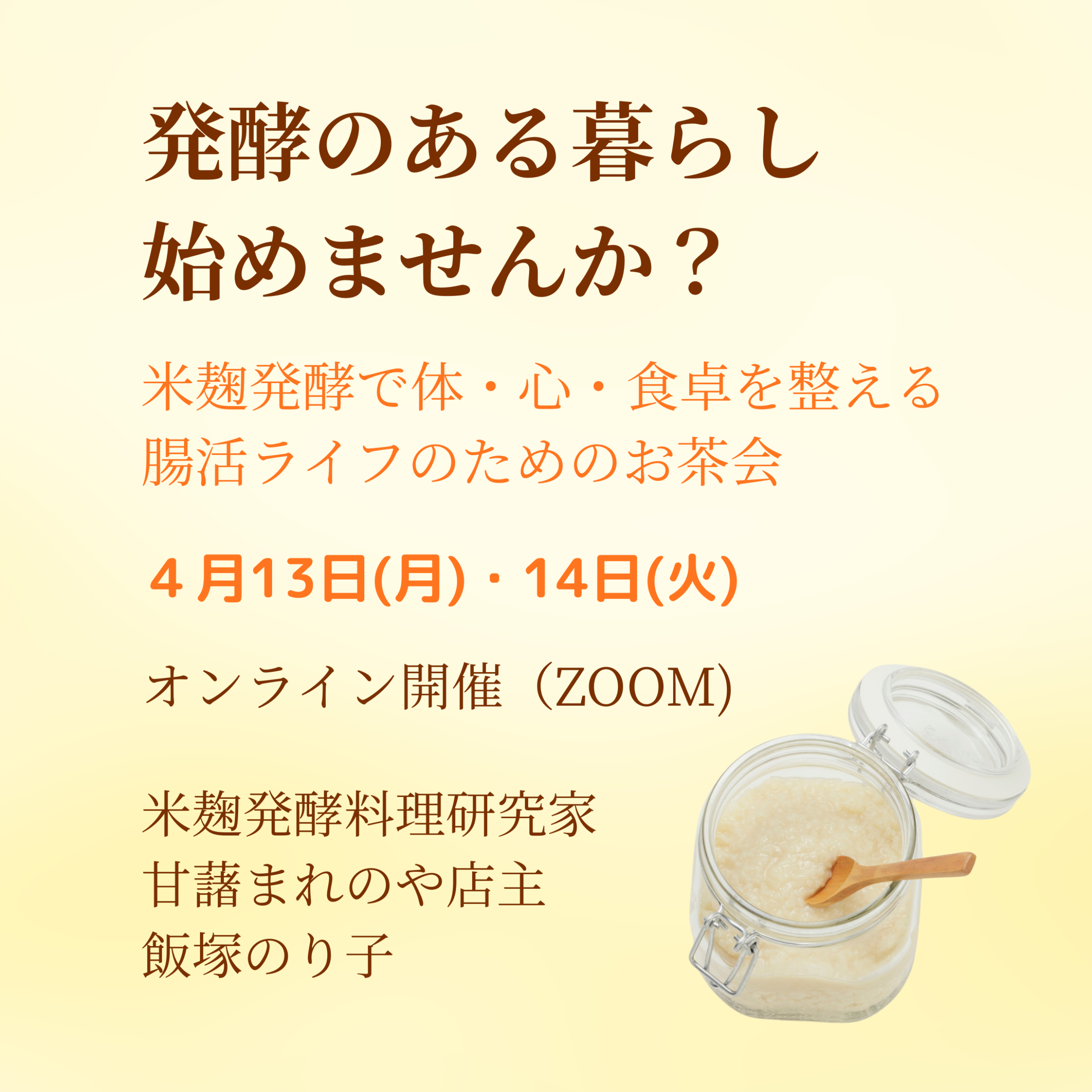🌾発酵のある暮らし、始めませんか? ― 米麹発酵で「心・体・食卓」を整える腸活ライフ ― 忙しい毎日の中で、なんとなく疲れやすい、気分が落ち込む、 そんな小さな不調を感じていませんか? 実はその原因、腸の乱れが関係しているかもしれません。 日本に古くから伝わる「米麹の発酵」には、 腸を整え、心を穏やかに、体を内側から元気にする力があります。 このお茶会では、米麹発酵の基本から 毎日の食卓に取り入れるコツまで、 やさしく、分かりやすくお伝えします。 🍚このお茶会で学べること 米麹発酵で「腸と心」が整う理由 塩麹・醤油麹・玉ねぎ麹などの使い分けと活用法 忙しくても続けられる“発酵のある暮らし”の始め方 家族の健康と笑顔をつくる、腸からの食卓づくり 💫こんな方におすすめです 便秘や肌荒れなど、なんとなく不調を感じている方 甘酒や米麹発酵調味料に興味があるけれど、どう取り入れたらいいかわからない方 心と体を整えながら、家族の健康を守りたい方 発酵を通して、やさしくナチュラルな暮らしを始めたい方 🍀講師紹介 飯塚のり子 米麹発酵料理研究家 甘藷まれのや店主 東京都大田区蒲田にて、さつまいも菓子と甘酒の専門店「甘藷まれのや」を営む。 素材本来の味を生かし、お客様の心がほっとするような体に優しい商品を手作りしている。 米麹発酵料理研究家として、お店で扱う米麹を活用した「塩麹」「醤油麹」「玉ねぎ麹」「生姜麹」「にんにく麹」といった様々な発酵調味料の作り方や日常の食事に取り入れやすい発酵料理を提案。 腸内環境を整え、心と体のバランスを整える。食生活の大切さを発信している。 これまでに講座やワークショップを通じて、初心者でも楽しく実践できる内容を多数提供。 日々の食卓が豊かになり、健康につながる発信の魅力を広く伝えている。 「発酵は難しくない。暮らしの中に“麹のやさしさ”を取り入れることから始まります。」 🗣️お客様の声 🌸 40代・女性/天然酵母パン教室主催 パンと一緒にお出しする料理のレパートリーが大幅に増えました。 生徒さん達からたくさんお褒めの言葉をいただけるようになり、本当に感謝しています 🍀 50代・女性/助産師 毎朝の甘酒習慣で、便通が驚くほど良くなり肌の調子もアップしました。 普段仕事がなかなかハードですが、疲れにくくなりました 🌼 30代・女性/子育て中 米麹調味料は以前から気になっていたのですが、手作りするのが難しそうと言うイメージが強くいつも市販品で賄っていました。 今回ご縁があり受講しましたが、大変役に立つ内容でした。 米麹調味料は自分で簡単に失敗なく作れるんだ!と実感でき、あれからずっと手作りしています。 お料理の幅はぐっと広がり、それなのに手間はどかっと省けて、しかも体に良いことばかりなんて!ブラボー米麹! ☕開催概要 テーマ:発酵のある暮らし始めませんか? 内容:米麹発酵で心・体・食卓を整える腸活ライフ 形式:Zoomオンラインお茶会 参加費:無料 特典:当日限定🎁 発酵調味料を使った料理レシピPDFプレゼント 🌸お申込み方法 申込みボタンから簡単にお申込みいただけます。 あなたも今日から、「発酵のある暮らし」を一緒に始めてみませんか? 腸が整うと、心も体も軽やかに。 発酵のチカラで、あなたの毎日がもっとやさしく変わります。