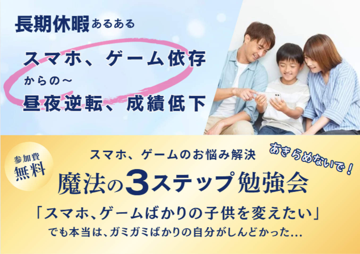「何度言っても宿題しない」「ゲームばかり…」 そのイライラ、今日で終わりにしませんか? スマホ、ゲームのお悩み解決 魔法の3ステップ 声掛けの順番と約束の作り方を変えるだけで、 子供は自分から動き始めます。 英語講師歴11年 ”動かない子ども”を次々と変えてきた 実践型の3ステップを大公開します。 こんな毎日に疲れていませんか? 「あと5分」の無限ループ 「ゲームやめなさい」「あと5分だけ」の繰り返し 結局2時間経っても終わらず、イライラが爆発してしまう... 約束を守らない罪悪感 「今度は守ってね」と言っても結局同じ 子どもも嘘をつくようになって、親子関係がギスギスしてしまう... 自分の時間がゼロ 子どもの監視ばかりで疲れ果て、気づけば自分のことは何もできない毎日 このままでいいのか不安になる... 「私の育て方が悪い?」 他の子は約束を守れているのに、うちの子だけ... 自分を責めて落ち込む夜が続いている... 将来への不安 約束も守れない子が、将来大丈夫?ニートになってしまわない? 漠然とした不安が心から離れない... 専門家の方法も効果なし 子育ての本を読んだり、セミナーに参加したり、 色々試してきたけれど結局何も変わらない もう諦めるしかないのかな... そんなことありません!! 「子供を変えたい」 でも本当は、しんどい親子関係から自分が救われたかった。 スマホ依存、昼夜逆転、遅刻、成績低下、悩みの絶えない長男の子育て 言えば言うほど反抗され、家の中はピリピリ。 下の子供たちや夫婦の関係も崩れ、全部が悪循環でした。 3ステップを実践したら...... 子どもが自分で動くようになり、家の空気がふっと変わりました。 まず一番変わったのは「私の心」でした 実は...このままだと大変なことになります 小中学生のお子さんを持つママの58%がスマホ・ゲームの時間を守らない、宿題、勉強をしない問題について深刻に悩んでいます でも、ほとんどの方が「正しい解決方法」を知らないまま、 毎日同じことを繰り返しています その結果、何が起こるでしょうか? ❌ 親子関係がどんどん悪化していく ❌ 子どもが嘘をつくことが当たり前になる ❌ ママのストレスが限界を超え、心身に支障をきたす ❌ 子どもの自立心や責任感が育たない ❌ 家族全体が不幸な雰囲気に包まれてしまう でも、安心してください! 実は、この問題には「確実な解決方法」があるんです 子どもがスマホ、ゲーム時間を守れないのは本人のせいでもママのせいでもありません 約束の作り方を知らないだけなんです 受講された方の声 教室でも3ステップ活用しています 英検指導では スマホ、ゲームの誘惑に負けず 合格率100% 一発合格率87% という成果を上げてくれてます 魔法の3ステップ実践で 誘惑に負けずスマホ、ゲーム時間を守れる子になります 今だけの特別プレゼント 🎁 特典1 今日から変わる♡魔法の声かけ5選 🎁 特典2 10秒で動き出す!子どもが自分で 選べるアクションワーク 🎁 特典3 お子さん専用✨やる気スイッチ パーソナル診断(個別相談) 合計15,000円相当の特典を今だけ無料プレゼント!