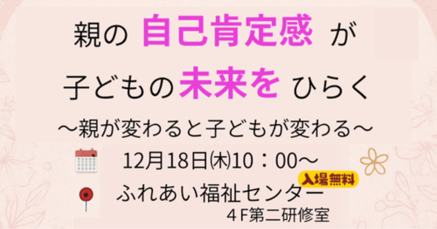子育てセミナー 『親の自己肯定感が子どもの未来をひらく』 〜ママが変わると子どもが変わる〜 ⋯子どもが変わると世界が変わる⋯ ママの「自己肯定感」を育てながら、 親子の関係や夫婦関係をもっとあたたかく、心地よくしていくための3回シリーズです こんなママにおすすめ! ★子どもに笑顔で寄り添いたい ★つい自分を責めてしまう ★子どもの良いところをもっと見つけたい ★家庭や職場でも自分らしく輝きたい どなたでもご参加いただけます シリーズの内容 1回目:4つの承認でママの心を満たす 2回目:自我自賛の力でママが笑顔に 3回目:聞く力で親子のつながりを深める 体感ワークを通して楽しく学べます ママの心が満たされると、 子どもは安心して自分らしさを伸ばしていきます✨ さらに夫婦関係、人間関係も良くなり毎日イキイキ輝ける 「自分を好きになり」 もっとラクに・楽しく子育てしませんか? 【第2回:自我自賛の力でママが笑顔に】 12月18日(木)10:00〜12:00 後半はみんなでお話会 長野市ふれあい福祉センター 4F第二研修室 参加費:無料 持ち物:手鏡 主催:しなの家庭教育研究所 連絡先∶08034515951(原山) ✉:shinano.katei.kenkyu@gmail.com ママの笑顔が、子どもの未来をひらく。 心がほっとする学びと体感の時間をぜひご一緒に・・・