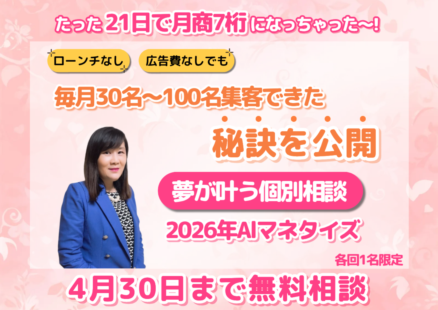 4月の集客から販売までオールインワンAI完全構築1DAYプログラム、たくさんの方たちが参加されました。 ありがとうございました。 1dayの日程が合わず参加が難しかった方たちも、かなりいましたので、個別相談の日程を設けました。 本気で2026年は、20名~100名以上集客していきたい方。 今年12月までに、100万円~1,000万円以上の売上を上げていきたい方。 4月だけ個別相談します。 私は9日間キャンペーン集客して、4日間だけ1dayオールインワンAI完全構築プログラムをして、21日間で7桁という成果を出しました。 今回だけじゃなくて、ここ3年間、AI活用を武器にして毎回キャンペーンや3日間チャレンジをして7桁以上です。 広告費なし!ローンチなし! そんなすごい秘密のオールインワンAI完全構築のやり方を知りたい方、個別相談をしたいと思います。