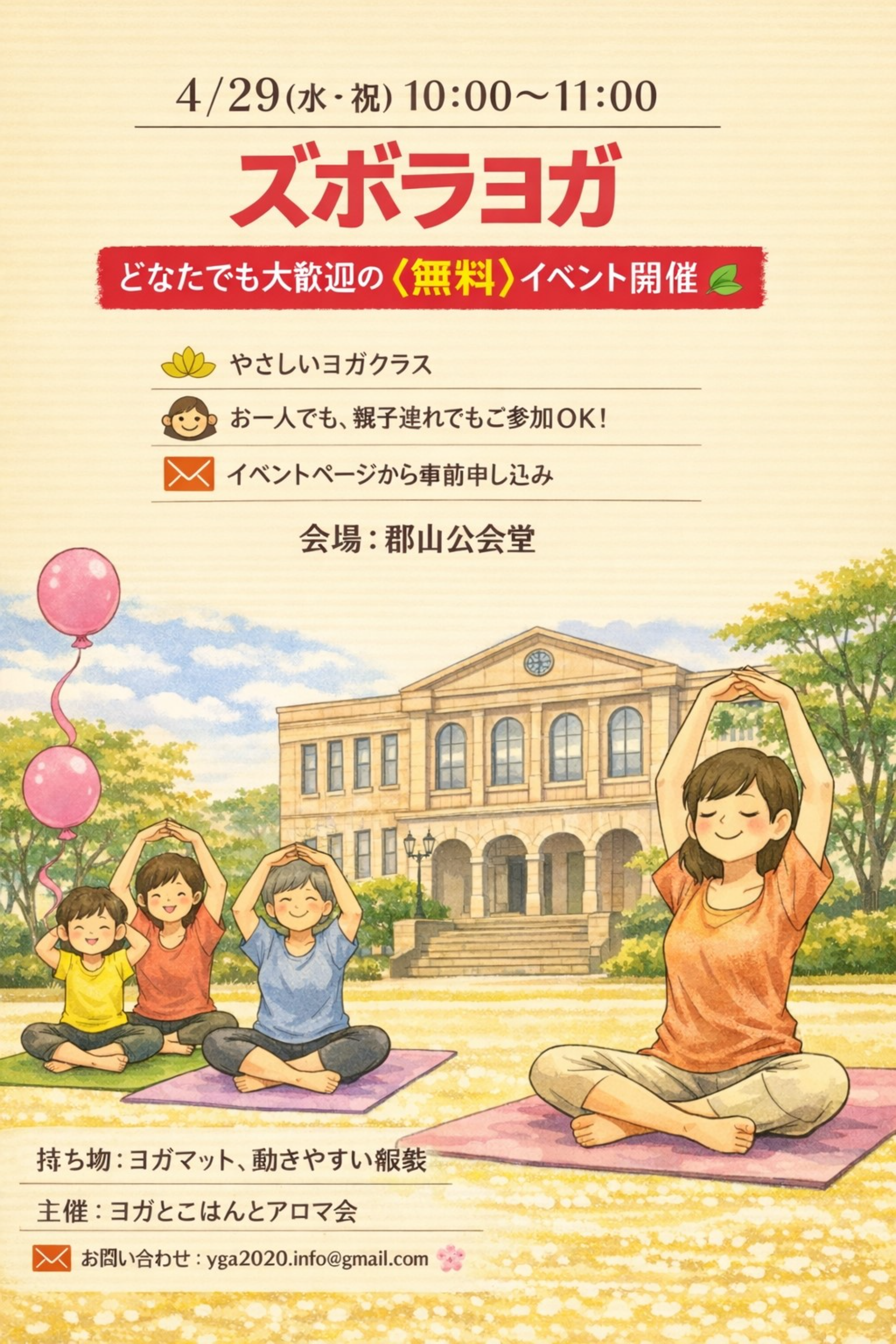 【無料】ズボラヨガ体験イベント|4/29(水・祝)郡山公会堂 🌸がんばらないヨガ、体験してみませんか? 「体が硬くても大丈夫?」 「運動不足だけど参加していいの?」 そんな不安がある方にこそ体験してほしい、やさしいヨガの時間です。 春のやわらかな空気の中、 “ポーズの完成”よりも“がんばらないこと”を大切にした「ズボラヨガ」で、 心と体をゆるめてみませんか? 📅 イベント概要 日時:2026年4月29日(水・祝)10:00〜11:00 会場:郡山公会堂(福島県郡山市) 参加費:無料 対象:どなたでも(初心者・おひとり様・親子連れ歓迎) 持ち物:ヨガマット(貸出あり)、動きやすい服装、水分補給用の飲み物など 定員:先着順(定員に達し次第締切) 📝 お申し込み方法 下記の「イベントに申し込む」ボタンより、イベントリンク内でお申し込みください。 ※事前申込制となっております。 👩🏫 主催・お問い合わせ 主催:ヨガとごはんとアロマ会 お問い合わせ:yga2020.info@gmail.com 🌼 メッセージ 春のひととき、ゆるっと整える時間を一緒に過ごしましょう。 ヨガが初めての方も、久しぶりの方も、どうぞお気軽にご参加ください🌿 🌿主催者プロフィール|ヨガとごはんとアロマ会 #ヨガとごはんとアロマ会 とは? 郡山市を拠点に、心と身体がかろやかになる週末ヨガクラスを運営しています。 「最近ちょっと運動不足かも…」という方に、がんばらなくても続けられる“ズボラヨガ”をお届けしています。 ヨガのあとは、参加者同士でほっと一息つけるお茶会タイムも。 「ヨガもいいけど、そのあとのおしゃべりが楽しみ!」という声も多数。 地域とつながることで、日々の暮らしにちょっとした潤いが生まれます。 ヨガを通じて、郡山の中にやさしいつながりを育てていくことが、私たちの願いです。 👤メンバー紹介 ◯ ゆきち(48歳) 認定ヨーガセラピスト/#Japaneseyoga 平日はサラリーマンとして人間磨き中。 2021年より週末限定のヨガクラスを本格スタート。 「がんばらないけど、ちゃんと効く」ズボラヨガが大人気。 自分自身も“がんばる”ことが苦手だからこそ、 「ゆるくていい」「できることをやればいい」そんな気持ちで続けられるヨガを大切にしています。 最近は「更年期に突入した今が一番元気!」と感じる日々。 心地よい生き方を、少しずつ見つけているところです🍀 ◯ としみん(48歳) ヨガとごはんとアロマ会 会長/受付係 10代から片頭痛に悩み、20代は整体通いの日々。 30代でヨガに出会うも、感覚的すぎて一度は挫折。 でも、郡山で出会った70代のヨガの先生とのご縁で、 「自分の感覚で整えるヨガ」に目覚めました。 整体に頼らず、自分で整えられるようになったことに感動し、 ゆきちと共にこの会を立ち上げ、現在は金沢と郡山を行き来しながら活動中。 受付では、来てくださった皆さんを笑顔でお迎えします。 お茶会では、つながりを育むお手伝いをしています🍵 🌼メッセージ 「楽しんでたら、いつの間にか元気になってた」 そんな体験を、あなたにも。 どうぞお気軽に、ふらっと遊びにいらしてくださいね!