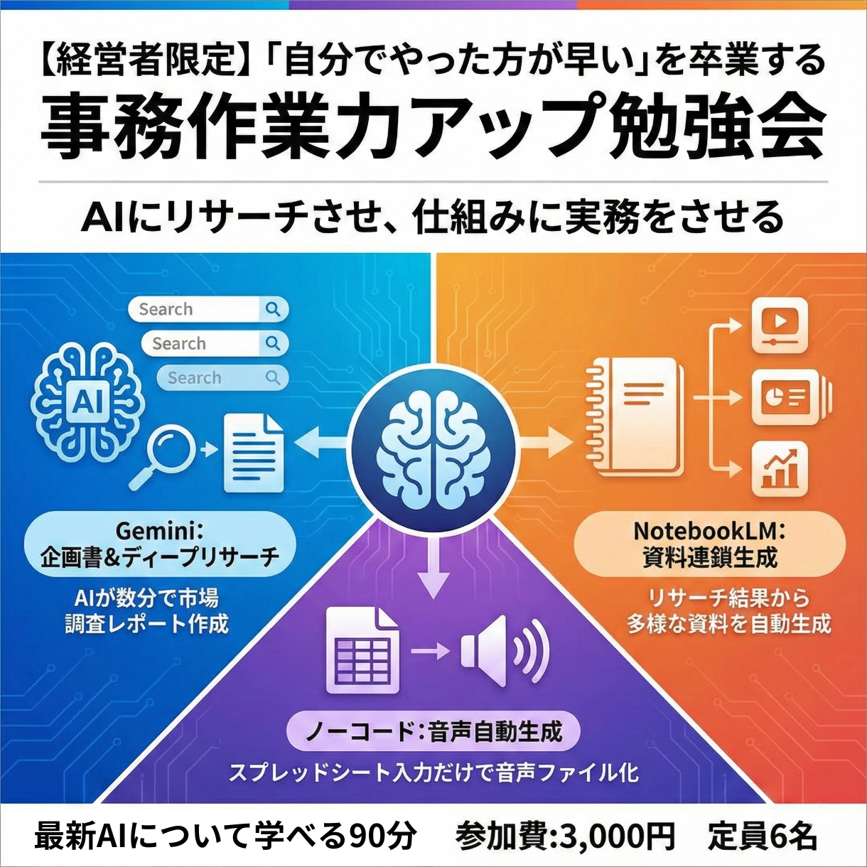 「人に振るための説明を考えている間に、自分で終わらせてしまう」 そんな多忙な経営者の皆様へ。 2026年、AIとノーコードの進化により、 「人に振る」というステップを飛ばして、 「AIにリサーチさせ、仕組みに実務をさせる」 ことが可能になりました。 本勉強会では、私が実際に活用している 「最新のリサーチ術」から 「音声ファイルの自動生成」まで、 その裏側をすべて公開・実演します。 🚀 勉強会のハイライト 1. 【Gemini】企画書の作成&ディープリサーチ革命 最新の「ディープリサーチ機能」を使い、 膨大なWeb情報から数分で精緻な市場調査レポートを 作成する実演を行います。 もう、リサーチに何時間も費やす必要はありません。 2. 【NotebookLM】リサーチ結果を「使い倒す」技術 Geminiで出力したレポートをNotebookLMに読み込ませます。 蓄積されたデータをもとに、紹介動画、スライド、インフォグラフィックスなど、 様々な資料を連鎖的に生成するフローを解説します。 3. 【ノーコード実演】「台本入力 ➡ 音声生成」の自動化 プログラミングの知識は不要です。 Googleスプレッドシートに台本を入力するだけで、 自動で読み上げ音声ファイルが生成される仕組みを実演します。 手作業を「仕組み」に置き換える感覚を体感してください。 🕒 開催概要 定員: 限定6名(少人数でじっくり質疑応答に応じます) 参加費: 3,000円 場所: オンライン 対象: 作業内容を整理して人に指示するのが手間に感じる経営者 最新のAIリサーチ機能をビジネスに直結させたい方 定型業務を「自動化」して、本来の経営判断に集中したい方 💡 メッセージ 「誰かに頼むより、自分でやった方が早い」 その感覚は正しいですが、 あなたの時間は有限です。 これからは「人」ではなく「AIと仕組み」に振る。 その第一歩を、この90分で踏み出しませんか?