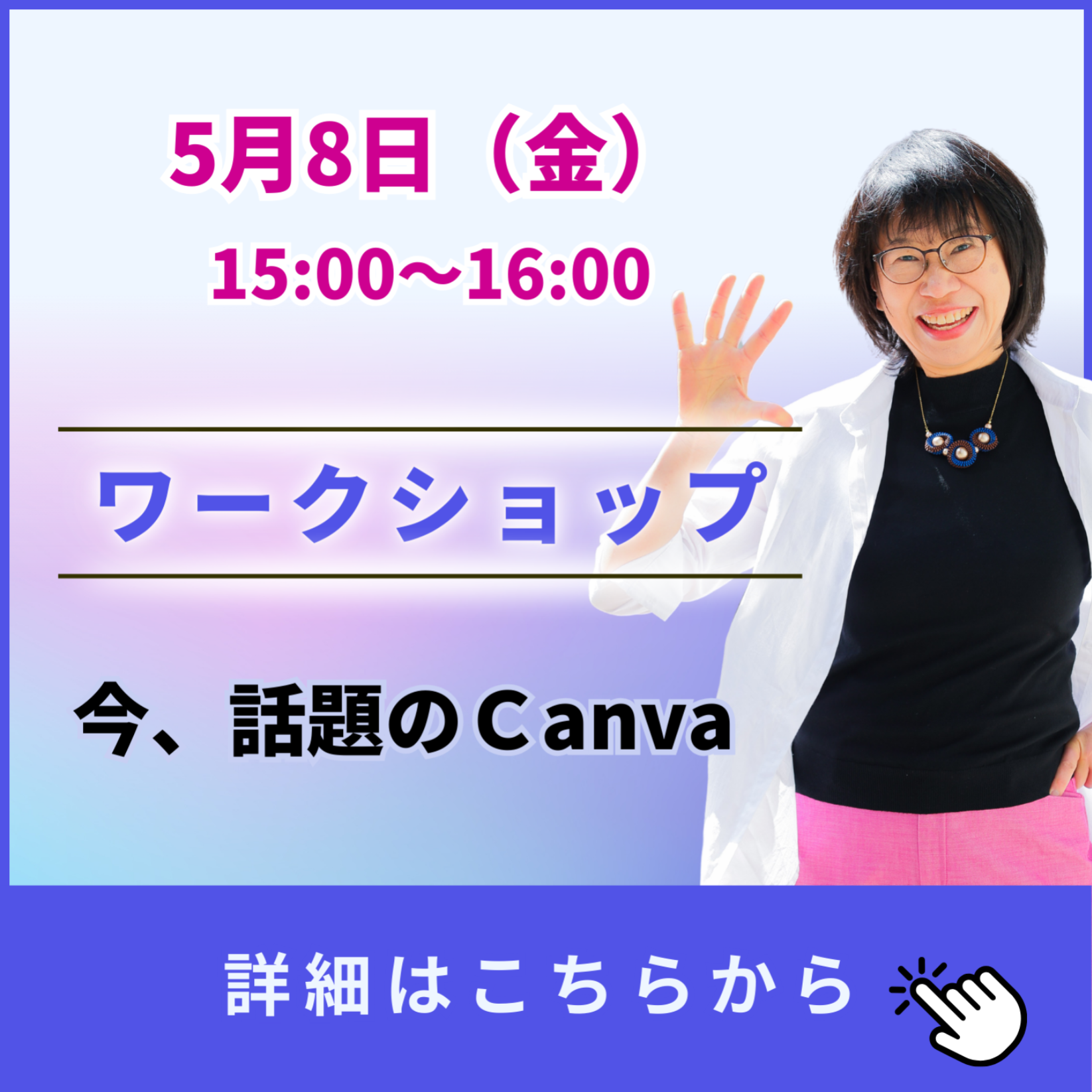 初めてでも大丈夫! 名刺をCanvaで作る流れを体験します! Canva(キャンバ)って、無料でも使えるし、 YouTube見れば、いろんな方法が紹介されているので、 タダでやろうと思えば、出来ちゃいます。 でも、そもそも何? って人には、Canvaが必要かどうかもわかりません。 そんな方に 「楽しい」「簡単」「便利」「タダなら」と 知ってもらう活動をしています。 ご 案 内 【開催日時】 5月8日(金)15:00~16:00 【場所】 市川市役所第一庁舎 2階 市民活動支援センター (ミーティングスペー12月 【住所】 千葉県市川市八幡1-1-1 【持ち物】 ノートパソコン (ネットに繋いで使用します) ※ 会場Wi-FiはフリーWi-Fiのため、 接続が不安定な場合があります。 操作される方は、スマホのテザリングや ポケットWi-Fi等をご利用ください。 ≪お願い≫ Canvaを登録してからお越しください。 登録方法 見学だけのご参加も歓迎です。 【人数】 限定 10名さま 【料金】 無料 【注意事項】 ・セミナー形式のため、 遅れての参加はそれまでの経緯の説明は致しかねます。 ・Windowsでの説明になります。 (Macでの対応もしています。安心してご参加ください) ・通信状況により、操作は見学形式となる場合があります。 【その他】 当日のご参加も可能です。(予約優先) お気軽にお越しください。 今回のワークショップがご縁となり、 Canvaの楽しみをシェアすることができたらこんなに嬉しいことはありません。 お会いできることを楽しみにしています。