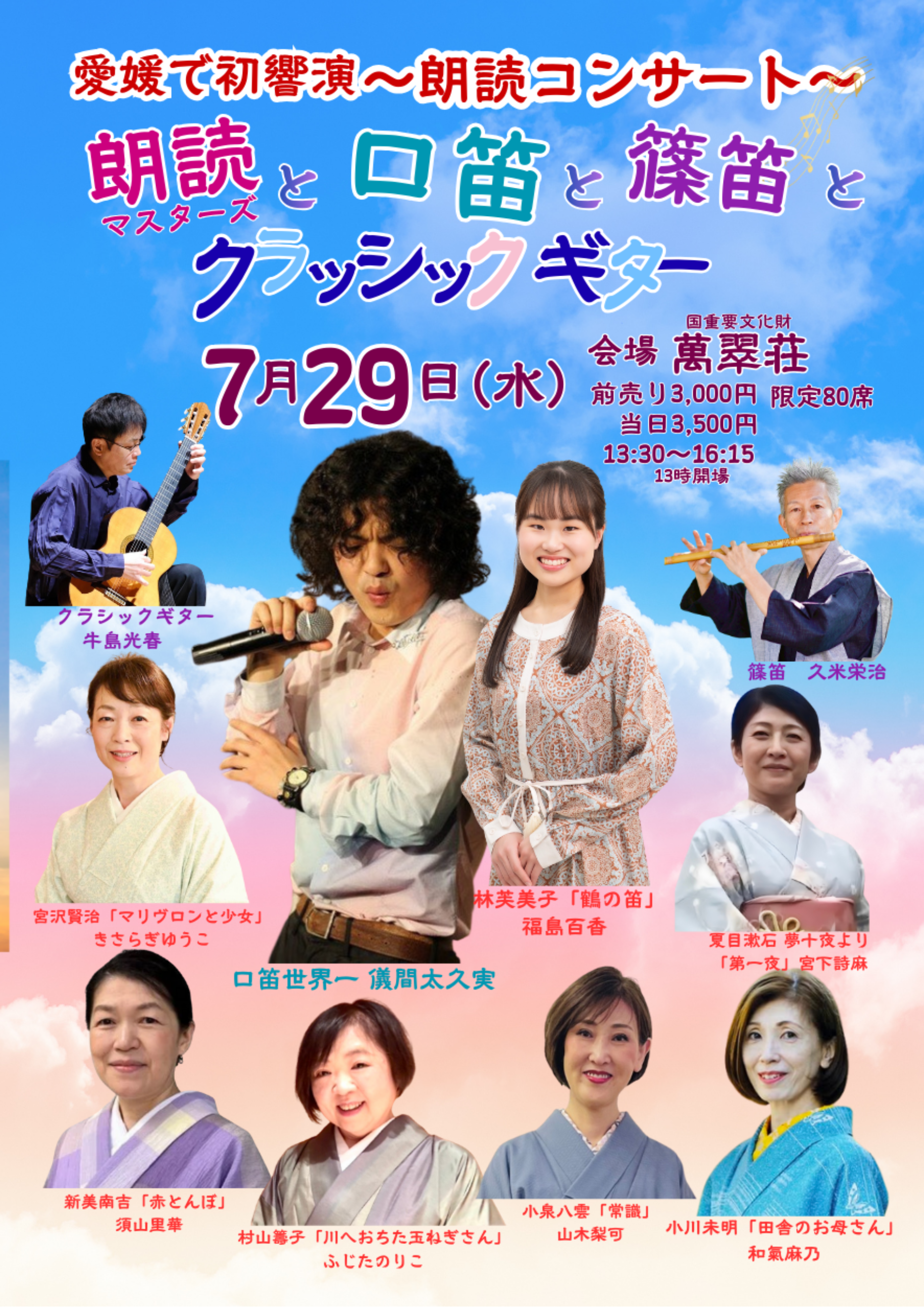 愛媛で初めての朗読ライブ 朗読と口笛と篠笛とクラッシックギター ぜひ足をお運びください。朗読マスターズの6名、そして、初愛媛、初松山のお2人のゲストをお招きしての響演です。 口笛世界一の儀間太久実さん、 NHK杯全国大学放送コンテスト朗読部門第一位の青山学院大学2回生の福島百香さんが、 素敵なパフォーマンスを見せてくださいます。 6人の朗読家は、久米栄治さんの篠笛の響きとともに心を込めて語ります。 今回は松山で人気急増中のクラシックギター奏者の牛島光春さんもご出演されます。 先着80名です。この機会にぜひ素晴らしいメンバーの響演をご覧ください。 【開催日時・場所】 7月29日(水)13:30~16:15 国重要文化財 萬翠荘 ◆出演者プロフィール と会場案内、アクセス