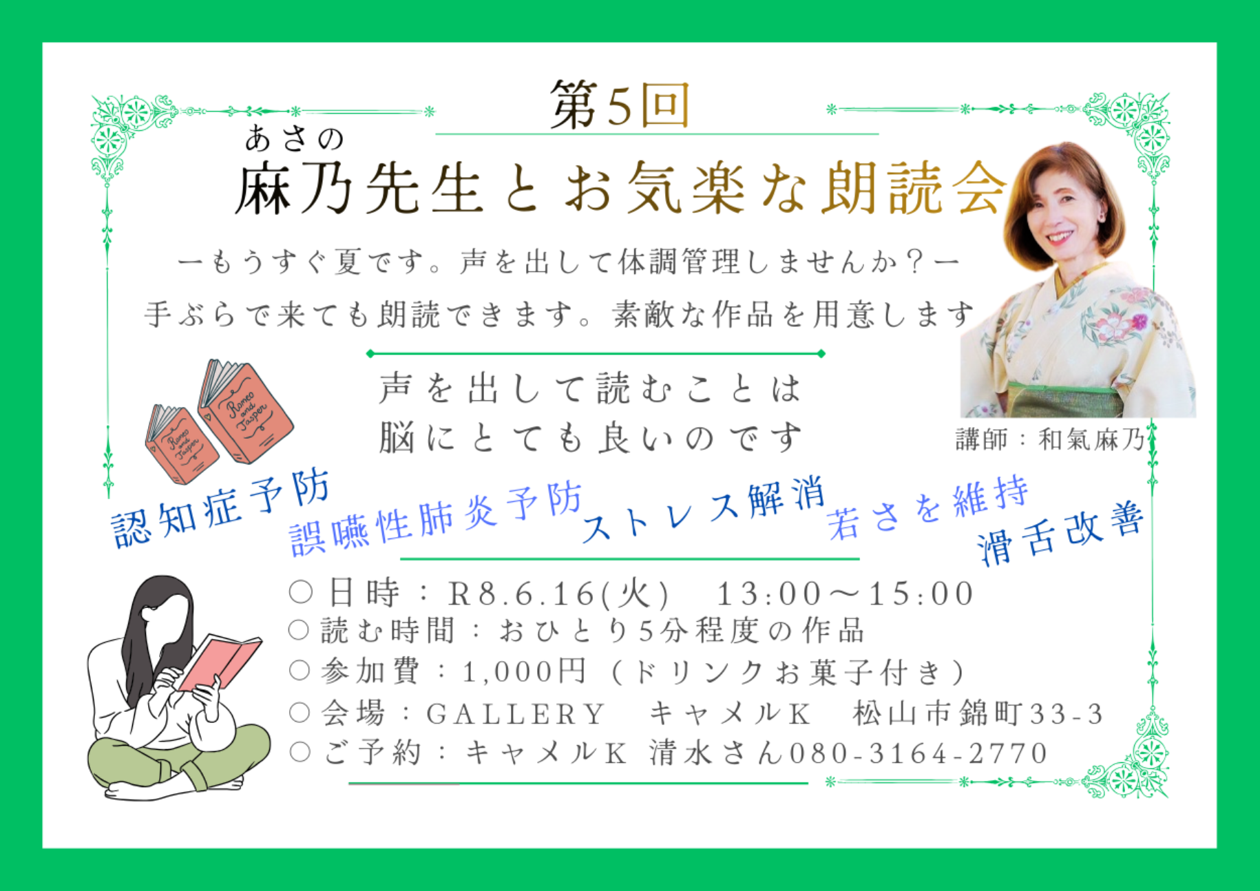麻乃先生とお気楽な朗読会 ぜひ気楽にご参加ください。 大好きな絵本と一緒に。 短い詩も大歓迎です。 朗読作品は6分程度のもので。 誰かにきいてもらいたい。いろんな人の、朗読を聞いてみたい。 そんな方のご参加をお待ちしています。 健康に不安はありませんか?。 日々生活していく中で、何かしたいと思いながら何もできない、しないでいる、「あなた」、ぜひ朗読をお勧めします。 ● 朗読ってどんなことするの? 声を出して読むだけです。意外とスッキリ、気持ちよくなり、心身ともにリフレッシュできます。 メリットもたくさんあります。 ①気持ちが落ち着く②やる気が出る③ストレス解消・抵抗力アップ④脳の活性化⑤滑舌改善⑥若返る⑦仲間ができる…など。まだまだあります。 年齢を自信をもって、楽しく重ねていくために・・。 朗読始めませんか? それはあなた自身です。 愛媛県で初めて音読トレーナーの資格を取得した講師が講座を開講致します。 ◆講師プロフィール シニア音読ヘルストレーナー和氣麻乃(わけあさの)と申します。 愛媛県で初めて「音読ヘルストレーナー」となりました。 青空文庫朗読コンテストで金賞受賞経験もあります。 朗読検定1級認定者です。 「ぐれえてる」朗読教室の主宰。朗読だけではなく、読み聞かせも学べます。 愛媛新聞カルチャースクールでも講師をさせていただいています。 よろしくお願い致します。