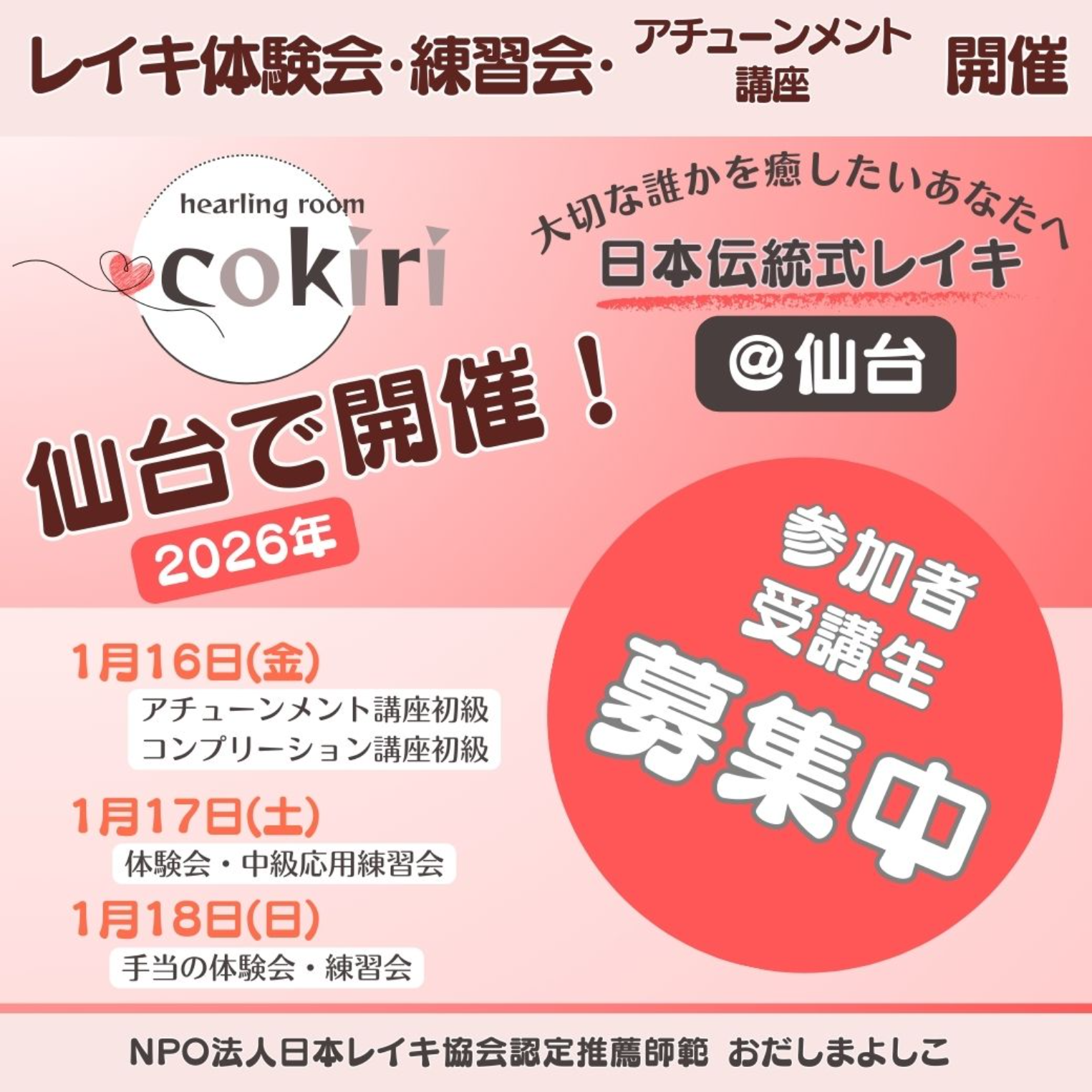 申し込み締め切り……開催日の8日前(1月8日(木)) 18日は各回限定2名の募集です! アチューンメント講座中級・コンプリーション講座中級 アチューンメント講座上級・コンプリーション講座上級をご希望の方は、LINE公式アカウントにてお問い合わせください。 https://lin.ee/uJ6A5bo こんにちは! NPO法人日本レイキ協会認定推薦師範のおだしまよしこです。 『日本伝統式レイキ@仙台』 今年2月に初めて仙台で開催しまして、今年最後の開催も参加者さんに恵まれて、1年の締めくくりにふさわしく、とても充実した時間を過ごさせていただきました。 この場をお借りして、感謝申し上げます。 開催当初から、参加してくださった皆様、オンラインでつながってくださった皆様、 お問いあわせをしていただいたみなさま、 本当にありがとうございました。 回を重ねるごとに、内容をより充実させて、参加者の皆様にさらに寄りそった練習・体験をしていただけるようにしてきました。 アチューンメント講座を受講希望の方も、どうぞメッセージをお待ちしています。 https://lin.ee/uJ6A5bo 初のお出かけイベント『るーぷる仙台』で行く、伊達家ゆかりのパワースポット巡り も無事開催しました。 今後もおりを見てお出かけイベントを開催したいと思っています。 あそこに行ってみたいとかご意見がありましたら、遠慮なくメッセージをお寄せくださいませ。 https://lin.ee/uJ6A5bo 『日本伝統式レイキ@仙台 ~大切な誰かを癒したいあなたへ~』 おかげさまで参加者さんにも恵まれ、大変好評をいただいています。 『また練習しに来たい!』 『東京は遠いけど、仙台で練習できるのはうれしい』 『仙台で講座を受講したかったのでいいタイミングです』 というお声もあり、本当に感謝の気持ちでいっぱいです。 仙台での活動を始めてよかったなあ……、と思う今日この頃です。 地元仙台に毎月帰るようになって半年、忙しいけれど、レイキに導かれるように満ち足りた日々を過ごしています。 ひとりでも多くの方とレイキに触れたその瞬間を共有して、一緒に幸せ山を登って行きたいと思います。 これからも、どうぞよろしくお願いいたします。 2026年1月は。、アチューンメント講座初級・コンプリーション講座初級を開催します。 コンプリーション講座は、当協会の受講生さんが対象です。 体験会は、レイキが初めての方も、気軽に参加していただけるようにレイキのエネルギーを感覚として体験していただけます。 前回ご参加くださった方も、しばらくレイキを使ってなかった方も、ぜひこの機会にレイキを使って心と身体を癒し、リラックスのひとときを一緒に過ごしませんか? また、施術ベッドを使って全身の手当てヒーリングの体験会・練習会も好評で、毎回あっという間に定員に達しています💦 少人数制なので、申し込み次第では締め切りが早まる可能性が......。 ですので、お早めにチェックされることをおススメします。 ■開催の詳細■ ★★レイキ体験会・練習会★★ 未経験の方大歓迎!レイキの流派スクール問いません。 呼吸法やセルフヒーリングなど、手を当てるだけであったかーい心地よさや、ゆったりとした感覚を体験していただきます。 また、簡易アチューンメントをおひとりおひとりに行いますので、短い時間ですが、レイキエネルギーをきっと感じることができます。 さらに、日常を楽しむレイキの使い方もお伝えします。 また、中級以上の応用練習会は、シンボル・マントラや手技を使って、ちょっと上を行く練習をしていただきます。 ★★施術ベッドを使ったヒーリング体験会・練習会★★ 体験会は未経験の方大歓迎!レイキの流派スクール問いません。 ほぼほぼマンツーマンで行う、プレミアムなヒーリングの体験会です。 寝て癒され、手を当てて癒される、リラックスなひとときをお楽しみいただけます。 ※中級以上の応用練習会では、日本伝統式レイキの中級講座で学んだ、シンボル・マントラや手技を使って、ちょっと上を行く手当の練習をしていただきます。※今回は、日本レイキ協会で中級以上を受講された方が対象です。 レイキはこんな方におススメ! ✔ストレスや疲れを感じている方(忙しい毎日で、ホッと一息つきたい…) ✔リラックスしたい方(心や身体の疲れを癒したい) ✔レイキに興味があるけれど、体験したことがない方(未経験の方、初心者大歓迎!) レイキは、心と身体のエネルギーバランスを整え、私たちが本来持っている安心感『ゆるぎない安らぎ』、そして運命を受け入れ自然体で生きる力を引き出してくれます。 現代社会では、ストレスや不安に振り回されることも多いですが、レイキを実践することで、外側の状況に振り回されず、穏やかで満たされた心を育むことができます。 今回のイベントも、そんな感覚を体験していただけるような、心地よい時間になればと思っています。 ●アチューンメント講座初級 レイキの学びの入り口です。誰でも必ずレイキが流せるようになり