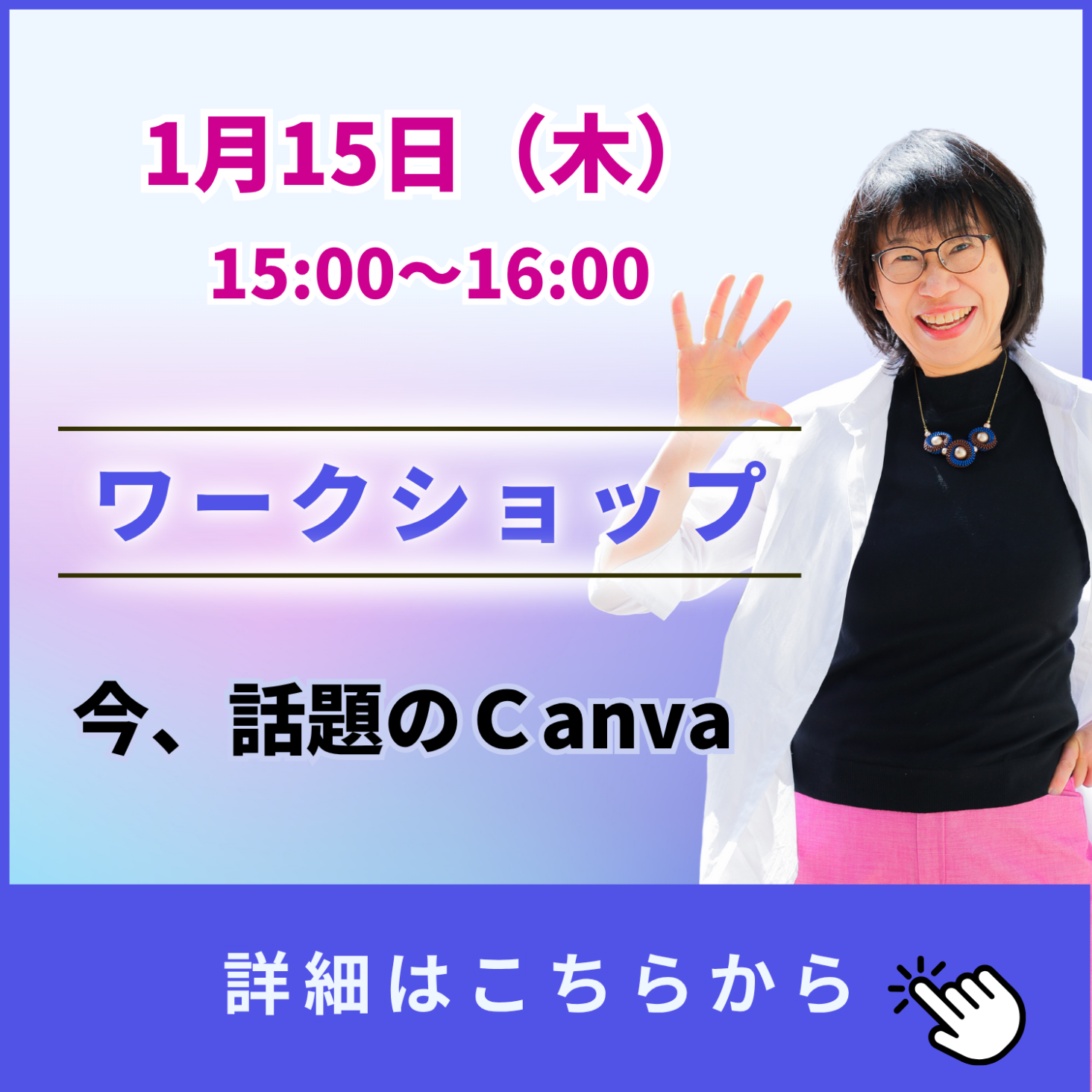 初めてでも大丈夫! 名刺をCanvaで作ります! Canva(キャンバ)って、無料でも使えるし、 YouTube見れば、いろんな方法が紹介されているので、 タダでやろうと思えば、出来ちゃいます。 でも、そもそも何? って人には、Canvaが必要かどうかもわかりません。 そんな方に 「楽しい」「簡単」「便利」「タダなら」と 知ってもらう活動をしています。 ご 案 内 【開催日時】 1月15日(木)15:00~16:00 【場所】 市川市役所第一庁舎 2階 市民活動支援センター (ミーティングスペー12月 【住所】 千葉県市川市八幡1-1-1 【持ち物】 ノートパソコン(ネットに繋いで使用します) ≪お願い》 Canvaを登録してからお越しください。 登録方法 見学だけも歓迎です。 【人数】 限定 10名さま 【料金】 無料 【注意事項】 ・セミナー形式のため、 遅れての参加はそれまでの経緯の説明は致しかねます。 ・Windowsでの説明になります。 (Macでの対応もしています。安心してご参加ください) 【その他】 当日のご参加も可能です。(予約優先) お気軽にお越しください。 今回のワークショップがご縁となり、 Canvaの楽しみをシェアすることができたらこんなに嬉しいことはありません。 お会いできることを楽しみにしています。