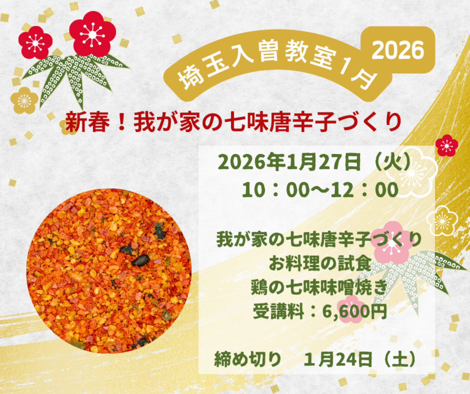 ぴーずはーぶ埼玉教室 埼玉教室オリジナルのカリキュラム 講座内容のご希望などありましたら、 ぜひ、リクエストしてくださいね 【日程・内容】 1月27日(火)10:00~12:00 新春我が家の七味作り 七味もご自身やご家族の好みの味にできる我が家の七味づくり 新春にちなんで、陳皮も加わった七味作ってみませんか? もちろんご自身お好みのブレンド七味が作れます お料理の試食:鶏の七味味噌焼き 締め切り:1月24日(土) 【受講料】 6,600円 【持ち物】 筆記用具・エプロン・布巾(調理器具やお皿・カップなど使う場合、拭くために使います) 【受講料のお支払い】 お申し込みから1週間以内に、口座振り込みかクレジットでお支払いください お申し込み・受講料のお振込み完了でお席の確保となります。 振込手数料のご負担願います お支払いに関する詳細は、キャンセルポリシーをご確認ください 【受講料お振込み先・クレジット】 お申し込み完了メールに記載されています 必ずご確認ください *お申し込みの前に必ずご確認ください <ぴーずはーぶ埼玉教室受講規約(キャンセルポリシー)> *受講料はお申し込み後、1週間以内に口座振込かクレジット(整い次第お知らせいたします)でお支払いください 受講料のお支払い完了で、正式なお申し込みとなります。満席の可能性がある場合、お申し込みのみのお席の確保はできませんのでご注意ください *一度、お振込みになられました受講料の返金はいたしません。 ただし、開催1週間前までのキャンセルのご連絡に関しましては、次回の開催の振り替えができます。 *キャンセルは1週間前までで、次回の開催の振り替えができます。それ以降から当日のキャンセルにつきましては、振り替えはできませんので、ご注意ください。その際、その回の実習材料か完成品(どちらかお選びください)、レジュメ(資料)、お料理レシピカードを配送させていただきます。(配送材料は講座の内容により変わります) *天候不良(台風・大雪など)の場合は、講座事態を中止する場合がございます。 その際は前日までに、参加の皆さんに公式LINEにてお知らせいたします。(必ず公式LINEへのご登録をお願いいたします) その場合、受講料は次回の講座の振り替えにいたしますが、材料によっては、配送対応になる場合がありますので、ご了承ください。(実習材料が生もの(例えば、柚子など)) *受講締め切りは開催の1週間前、開催が決定している講座に関しては3日前まで受け付けますが、キャンセル不可になりますので、ご注意ください。満席の場合はその時点で締め切ります。 *参加に際しまして、埼玉教室はスタッフがおりませんので、都度、会場の片づけなどのご協力をお願いいたします。 *不明な点等ありましたら、些細なことでも構いませんので、ご連絡ください *皆さんと楽しい講座にしていきたいと思いますので、よろしくお願いいたします 講師プロフィール 水澤博子 ぴーずはーぶ~always~主宰 *学んだ知識・取った資格は眠らせない! 資格取得から講師認定、家庭でも仕事でも即活用、 活躍できる実践重視の料理教室* *あなたの夢を叶える未来を見据えた、 心と身体が喜ぶ料理教室* 日本メディカルハーブ協会認定教室・国際食学協会加盟教室 ぴーずはーぶ~always~千葉・松戸教室 メディカルハーブやスパイス、マクロビオティックや調味料など 資格取得から実践まで学べる料理教室を主宰。 「Think(考える) Choice(選択する) Practice(実践)」 をコンセプトに、学ぶことで様々なこと考え、選択する力を身につけてほしい。 学んだ知識や資格を無駄にすることなく 日々の生活やお仕事に活用していけるように しっかり実践力も身につく教室です! 協会認定の資格取得講座と 実践的に活かしていけるブラシュアップ講座を開講中!(通学・オンライン対応) ・日本メディカルハーブ協会認定 ホリスティックハーバルプラクティショナー ・日本メディカルハーブ協会認定ハーバルプラクティショナー ・日本メディカルハーブ協会認定 シニアハーバルセラピスト ・日本メディカルハーブ協会認定ハーバルセラピスト ・日本メディカルハーブ協会認定メディカルハーブコーディネーター ・日本メディカルハーブ協会認定ハーブ&ライフコーディネーター ・国際食学協会準食学士 ・国際食学協会マクロビオティックA級ライセンス ・国際食学協会食学調味料アドバイザー ・国際食学協会食学アドバイザー認定講師 ・日本成人病予防協会 健康管理士一般指導員 ・日本成人病予防協会健康管理能力検定1級 ・日本アロマ環境協会 アロマ検定1級 ・日本園芸協会認定 薬草ガーデンマスター ・S&B スパイス検定2級 ・調理師