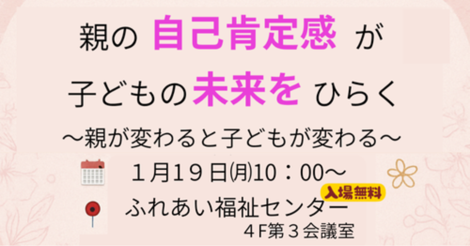 子育てセミナー 『親の自己肯定感が子どもの未来をひらく』 〜ママが変わると子どもが変わる〜 ⋯子どもが変わると世界が変わる⋯ ママの「自己肯定感」を育てながら、 親子の関係や夫婦関係をもっとあたたかく、心地よくしていくための3回シリーズです こんなママにおすすめ! ★子どもに笑顔で寄り添いたい ★つい自分を責めてしまう ★子どもの良いところをもっと見つけたい ★家庭や職場でも自分らしく輝きたい どなたでもご参加いただけます シリーズの内容 1回目:4つの承認でママの心を満たす 2回目:自我自賛の力でママが笑顔に 3回目:聞く力で親子のつながりを深める 体感ワークを通して楽しく学べます ママの心が満たされると、 子どもは安心して自分らしさを伸ばしていきます✨ さらに夫婦関係、人間関係も良くなり毎日イキイキ輝ける 「自分を好きになり」 もっとラクに・楽しく子育てしませんか? 【第3回:聞く力で親子のつながりを深める】 12月19日(月)10:00〜12:00 後半はみんなでお話会 長野市ふれあい福祉センター 4F第3会議室 参加費:無料 主催:しなの家庭教育研究所 連絡先∶08034515951(原山) ✉:shinano.katei.kenkyu@gmail.com ママの笑顔が、子どもの未来をひらく。 心がほっとする学びと体感の時間をぜひご一緒に・・・