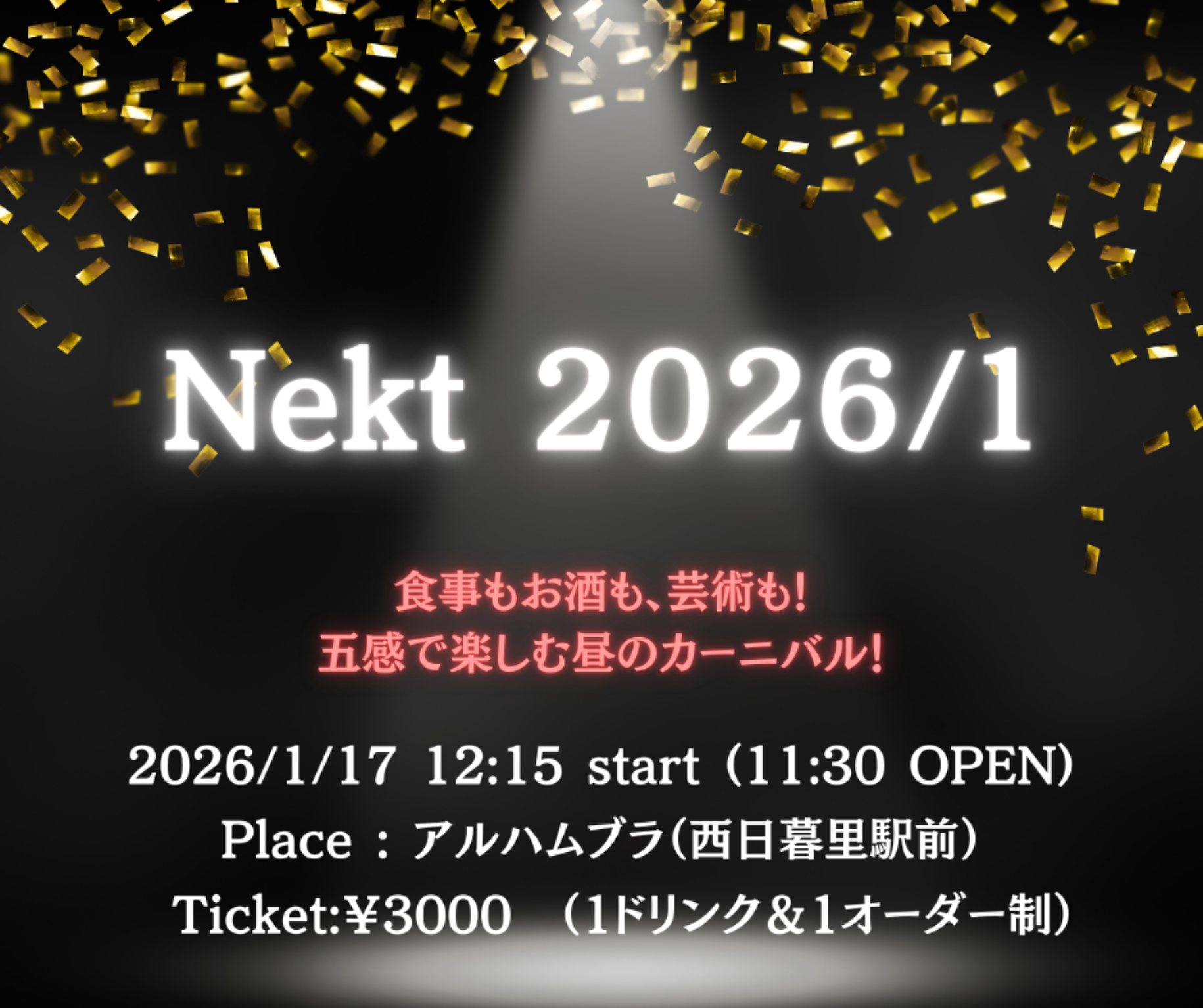 Nekt 2026/1 初心者~世界チャンピオンまで 5感で楽しむ昼のカーニバル •同席希望のお客様は必ず人数を入力のうえまとめてお申し込みください。 この際「行く人を追加する」の入力は必要ありません。 •多くのお客さまに楽しんでいただくためにご相席をお願いする場合がございます。ご理解ご了承のほどよろしくお願いいたします。