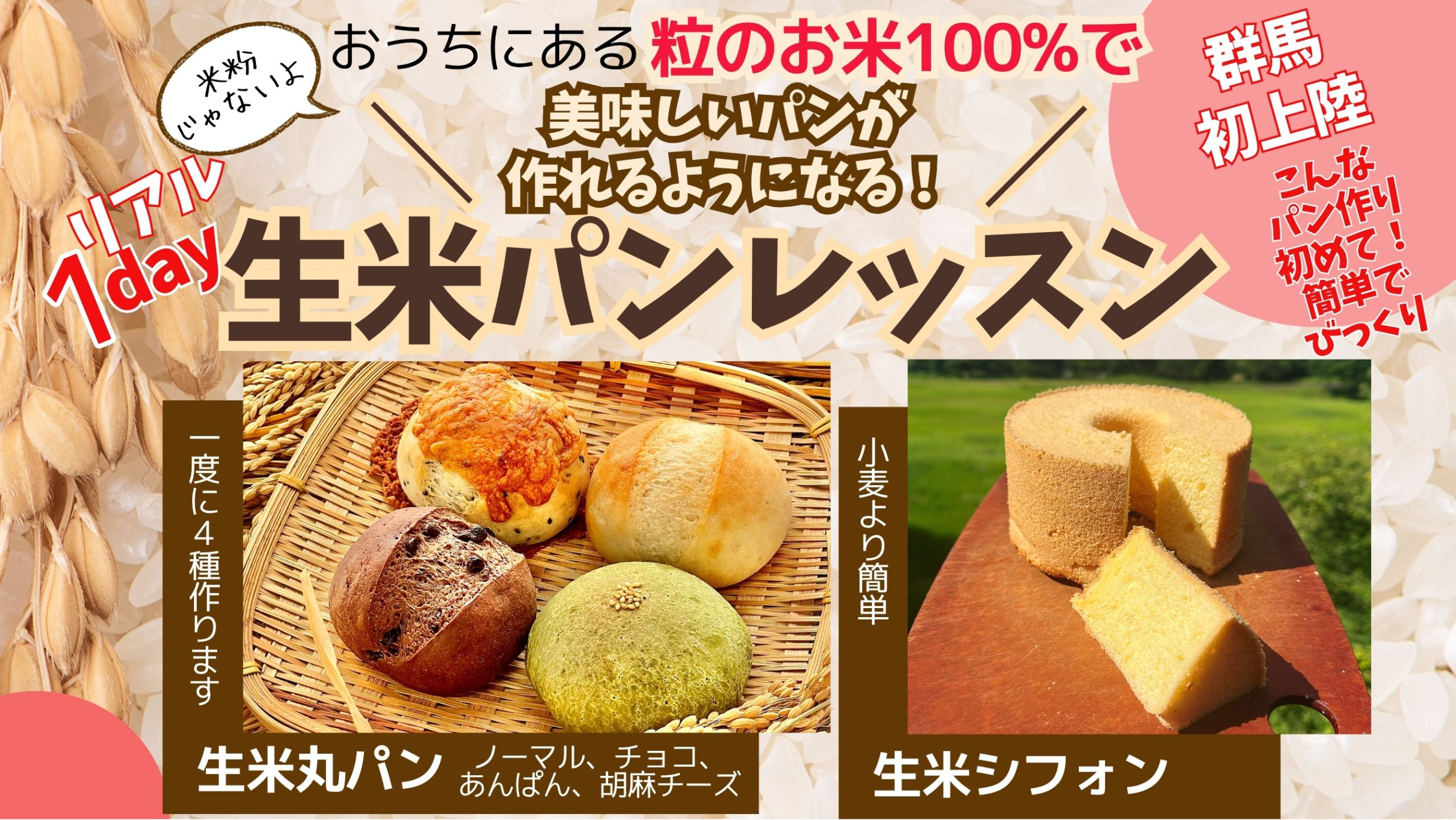 🔴1DAYレッスン日程🔴 昨年9月〜毎回満席大好評で開催されてきています! 数少ない日程枠ですが、お早めにお申し込みください! ⚫︎12/15(月) 10:00〜12:30 生米丸パン 13:30〜15:30 生米シフォン ⚫︎1/22(木) 10:00〜12:00 生米シフォン 13:00〜15:30 ※10分前には来場お願いします。計量していただいて、定刻レッスンスタートさせていただきます。余裕をもってお越しください。 🔴場所🔴 道の駅まえばし赤城 2F調理室 群馬県前橋市田口町36 https://maebashi-akagi.jp/facilities 🔴価格🔴 丸パン ¥8,500 生米シフォン ¥8,500 👩紹介割引👦 お友達のご紹介で△500円 お申込されたお友達も△500円 ✌️複数回割引✌️ 2回目以降のレッスンも△500円 🔴お支払い🔴 当日現金。 釣り銭なしで、袋に名前を書いてお持ちください。 🔴お申込🔴 お申込ボタンにて ⭐️ご希望日程&内容をご確認いただき、お申し込み下さい。 ・ご登録されたメールにすぐにご案内が送られますので、ご確認ください。 ・お申込後はLINEにもご連絡ください。 ↓↓↓ 「生米パン🌾🥯阿部玲奈」公式LINE https://lin.ee/MEp8hNO 🔴内容🔴 生のお米から、 🔶丸パン;ノーマル、チョコ、あんぱん、胡麻チーズの4種を作ります。 🔶ハードパン;フランスパンとベーコンエピ。 🔶シフォン;お一人1ホール焼きます。 🔶うどん:一食分その場で食べていただけます 🔶蒸しパン:ベーキングパウダーで作る小さな蒸しパンを4つ ❤️お家でできるレシピやアレンジについてもお伝えします 🔴持ち物🔴 ◎エプロン ◎布巾 ◎ミキサー又はブレンダー ハンドブレンダーの方はセットでついている専用カップもお持ちください。 ※ない方はご相談ください ーーーーーーーーーーーーーーーーーーーーーーーーーーーーーーーーーーーーーーーーーーーー 皆さんに 簡単!美味しい!楽しい! と言っていただいてる生米パンですが。。。。。 copyright 暮らしパン/阿部玲奈