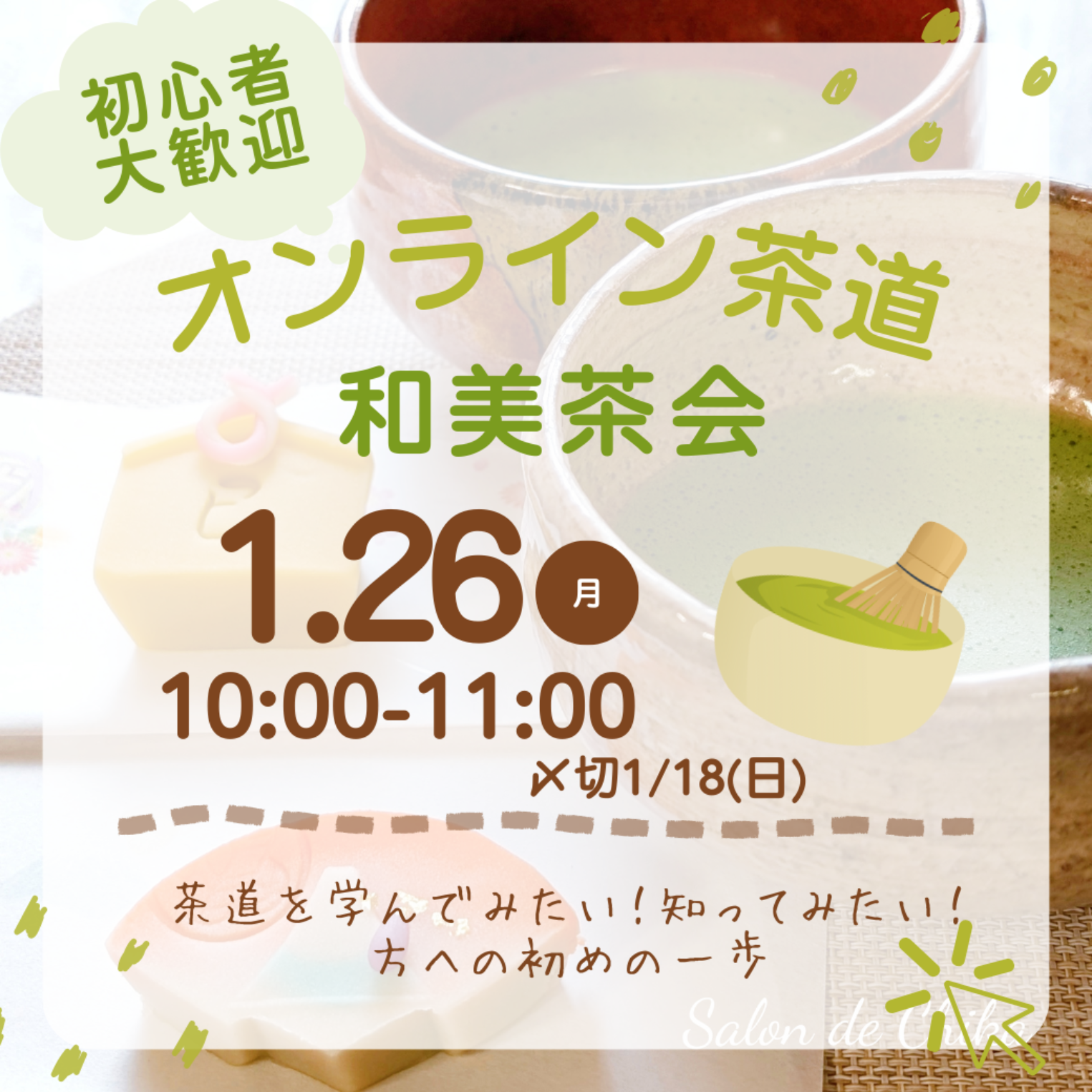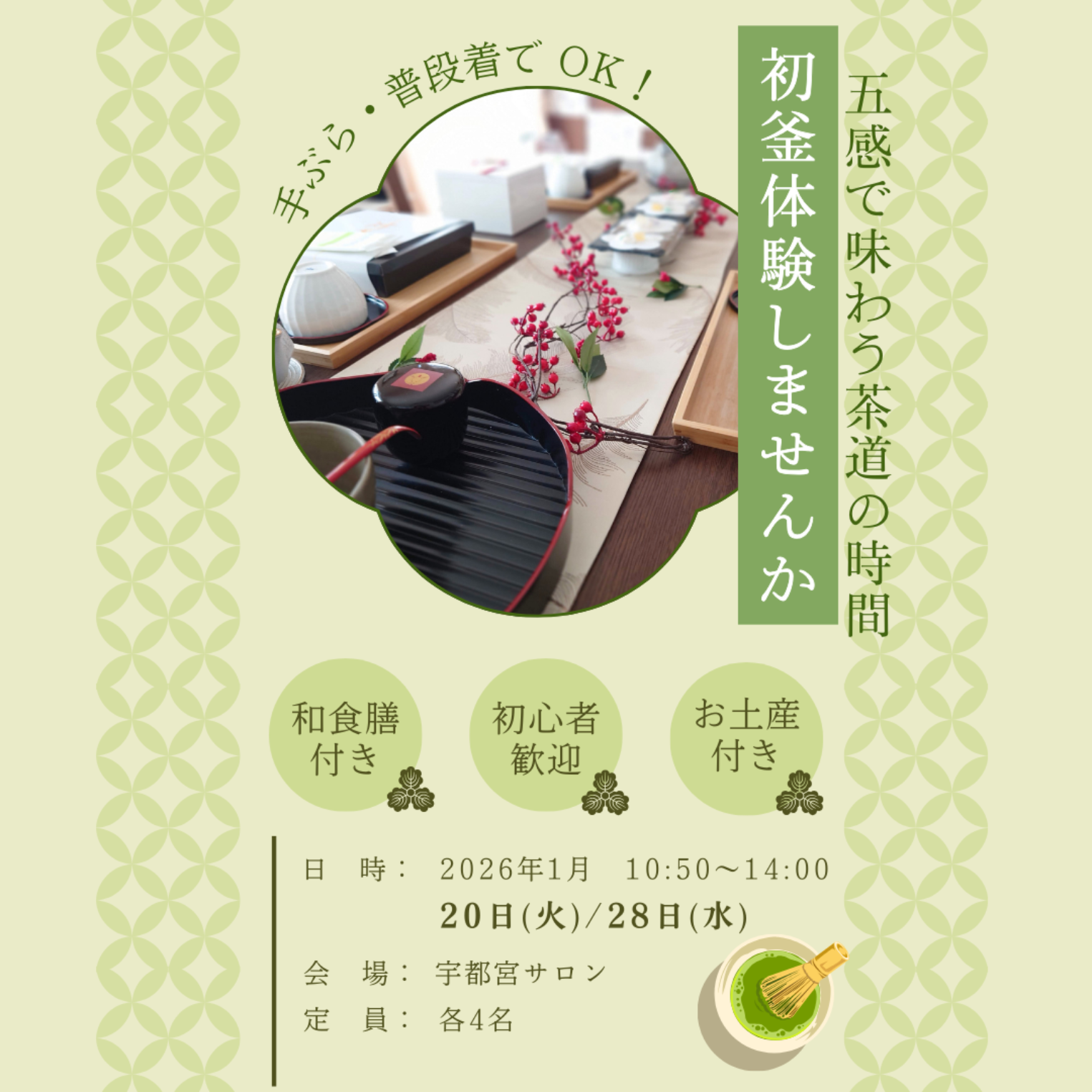 テーブル茶道 初釜体験 茶道で1月はとても大事な行事があります。 それは初釜 初釜とは年始のお茶会のようなものです。 新しい年に初めて釜をあけることから初釜といいます。 そしてこの時にいただく和菓子があります。 この時期だけしか食べれない特別なお菓子です。 昨年大変好評でした初釜。 本格的な初釜ではありませんが、テーブル茶道風の初釜として体験していただきたいと思います。 毎年、最初に懐石料理のお弁当をいただいておりましたが、2026年はサロン近くのお店で懐石料理をいただき 一緒に和のマナーを実践しながらお食事となります。 その後、サロンに戻りお茶と特別な和菓子で楽しんでいただきます。 また、茶道体験や初釜のお話もあります。 ご縁を大切にしているサロンですので、横の繋がりもつくっていただきたいです。 《こんな方にオススメ》 ・特別な和菓子に興味がある ・抹茶が大好き ・色々な方と交流したい ・茶道や抹茶に興味がある ・初釜体験してみたい ・和菓子大好き 初心者の方もお気軽にご参加くださいね! ◆講師プロフィール はじめまして、テーブル茶道とおもてなし装花講師 茶木ちかこです。 15年間専業主婦だった私ですが、子供が小学校高学年になり 一歩踏み出しおけいこ先生となりました。 現在はオンライン、リアルレッスンをしております。 裏千家茶道25年間、准教授の資格を活かしてテーブル茶道講師として活動。 また、テーブルコーディネートとアーティフィシャルフラワー(高級な造花)をかけあわせた おもてなし装花をしています。 テーブルコーディネートは企業のサイトに掲載されたりしております。 ◆お茶会の日程 【開催日時】 1月20日(火)10:50~14:00 1月28日(水)10:50~14:00 (終了時間は前後します) 【場所】 栃木県宇都宮市自宅サロン お振込み後に住所はご連絡します 【料金】 7,700円(PayPay、銀行お振込み) 昼食、和菓子、お土産付き *ご入金いただいた後はキャンセルできかねます。 抹茶や和菓子を楽しむ、茶道を身近に感じてもらたいです。 皆さまにお会いできることを楽しみにしています。