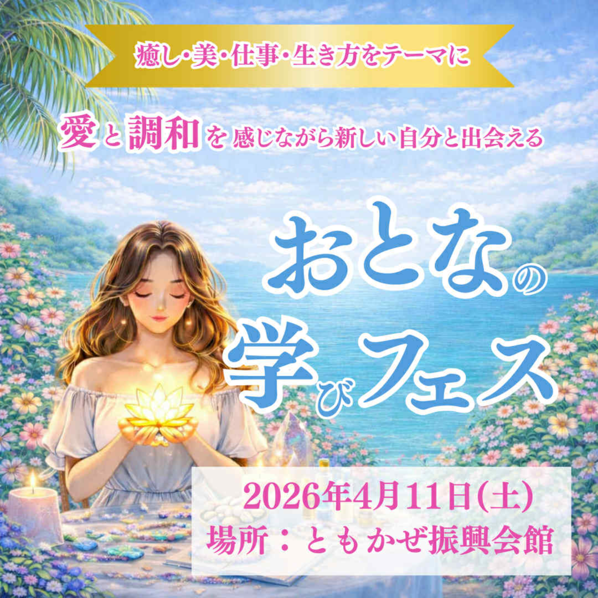 おとなの学びフェス沖縄は 癒し 美 仕事 生き方をテーマに 愛と調和を感じながら 新しい自分と出会える たった一日の学びイベントです 沖縄県内外問わず、 各分野のスペシャリストが集う おとなの学びフェス沖縄は 癒し 美 仕事 生き方を切り口に 占い スピリチュアル カウンセリング コーチ ハンドメイドやワークショップなど さまざまな分野の専門家と直接つながり 対話や体験を通して 今の自分にそっと必要な気づきやヒントを その場で受け取れる 一日完結型のリアルイベントです こんな方におすすめです