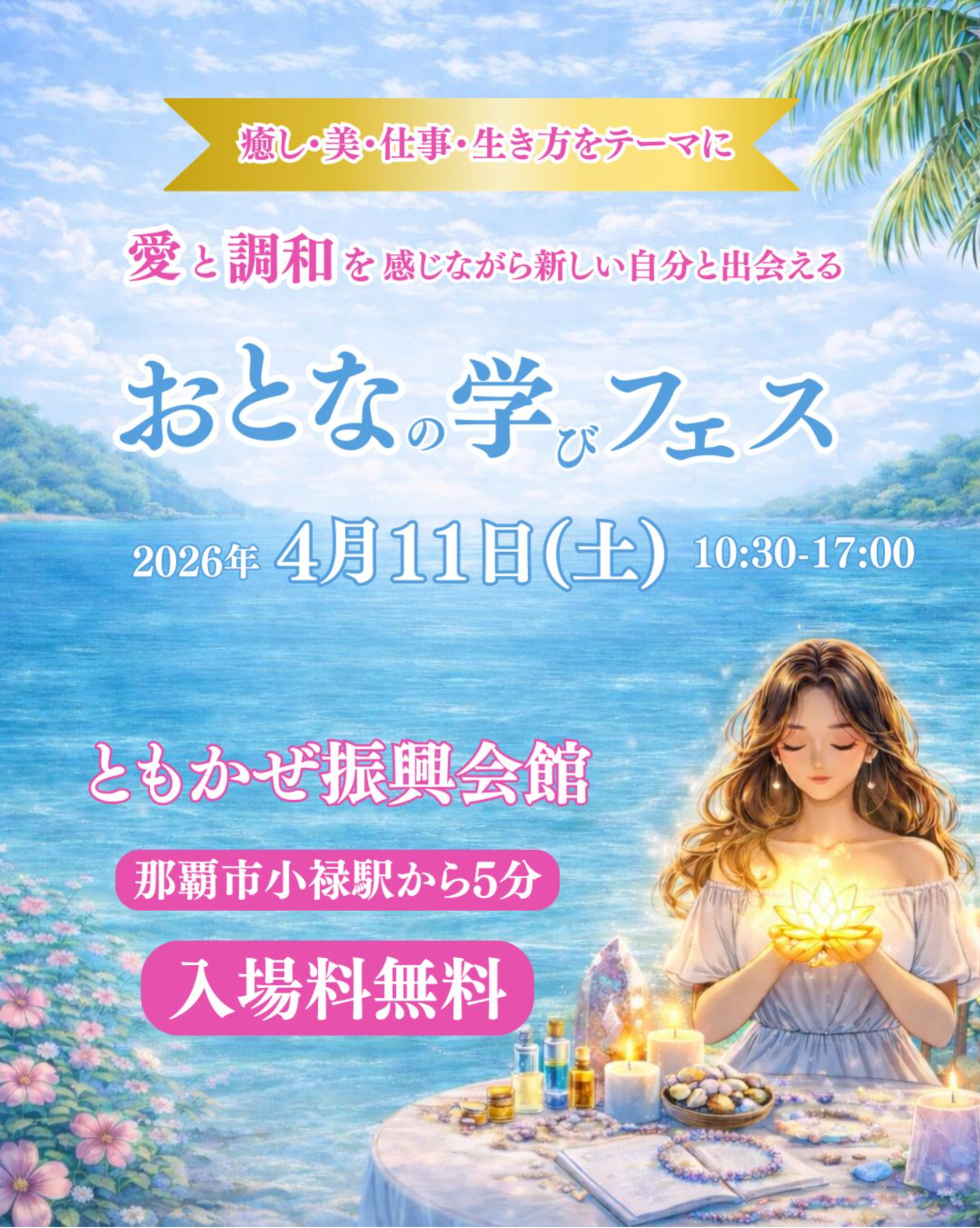 おとなの学びフェス沖縄は 癒し 美 仕事 生き方をテーマに 愛と調和を感じながら 新しい自分と出会える たった一日の学びイベントです 沖縄県内外問わず、 各分野のスペシャリストが集う おとなの学びフェス沖縄は 癒し 美 仕事 生き方を切り口に 占い スピリチュアル カウンセリング コーチ ハンドメイドやワークショップなど さまざまな分野の専門家と直接つながり 対話や体験を通して 今の自分にそっと必要な気づきやヒントを その場で受け取れる 一日完結型のリアルイベントです こんな方におすすめです 好きを仕事にするヒントを知りたい やりたいことはあるけど相談できる人がいない 今の働き方や生き方を見直したい 沖縄で心が動く出会いやつながりがほしい ブース出展 占い スピリチュアル、カウンセリング、コーチング ハンドメイド、物販、体験セッション ワークショップなど 一人ひとりと丁寧に向き合いながら 今の自分に必要なメッセージや学びを 受け取ることができます セミナー 好きを仕事にするための考え方 自分らしく進んでいくための視点を リアルな経験をもとに無料でお届けします 参加することで得られること 自分の好きを再確認できる 今の自分に必要な学びが見えてくる 一歩踏み出すためのヒントが得られる 同じ想いを持つ人と出会える 無料の参加登録をするだけで癒し・美・仕事・生き方をテーマにした4つの特典をプレゼント 後日LINEにて配信します 今すぐ運の流れを整える! 未来を変える開運体質チェックリスト 働く女性の印象を引き立てるアクセサリー選び3つのポイント チャンスを自然に引き寄せる人の3つの習慣 運命とご縁を好転させる!幸福体質に生まれ変わる3分結界動画 ※こちらの特典受け取りはイベント終了後LINEでの配信を予定しております おとなの学びフェス登録者だけの特別な特典になります 愛と調和の中で開運体質を手に入れて夢を叶える一歩を踏み出せますように! 開催日 2026年4月11日(土) 時間 10:30〜17:00 会場 ともかぜ振興会館 沖縄県那覇市金城3丁目5番地3 那覇空港からゆいレールで2駅、小禄駅から徒歩5分 駐車場もございます HPの下部にアクセス情報がございます 小禄駅からの詳しいアクセスはこちら 全セミナー無料開催決定 無料参加申し込みより事前申し込みのご協力をお願いしております (事前申し込みがなくてもご参加いただけますのでお時間がございましたお越しください 紹介者の確認をさせていただく場合があります (ご紹介者がいらっしゃらなくてもご入場いただけますのでご安心ください) どなた様でも少しでも学びたい、新しいことを知りたい、これからのヒントがほしい 素敵な出会いがほしいと思われたらご参加いただけますので気軽にお越しください スタンプラリー ブースもしくはセミナーを合計3つ以上回ってLINEスタンプを集めると 出展者からプレゼントがあります♪ なにが当たるかは当日のお楽しみ! ジャンケン大会 16:30よりイベントのさいごにお楽しみじゃんけん大会を企画しています 主催から沖縄といえば...心も体も浄化して軽く一歩を踏み出せる「あれ」もご用意 すでにLINEスタンププレゼントをもらった人も含め、 会場にいる全員参加できますのでさいごまでお楽しみください さらに今回は、各出展者からの特別なプレゼントを 来場された皆さま全員にご用意しています 当日お渡しするチラシの中に受け取り方を明記しておきますので 楽しみにしていてくださいね そしてもうひとつ Special presentを 当日セミナー講師を担当してくださる三上美幸先生よりご用意いただきました!! 著書 『結局、「すぐやる人」がうまくいく』を来場特典として無料でお渡しします 起業からわずか5年で年商2億円に到達した実績を持つ三上先生 その行動の考え方をまとめた本は、全国の書店で販売されている一冊です 「いつかやろう」が動き出すきっかけになりますように♡ ※書籍のプレゼントは、数量限定となります Q 誰でも参加できますか A どなた様でもお一人様でも参加可能です Q ブースの予約は必要ですか A ブース予約は必須ではございませんが、待ち時間なくご案内できる可能性がございます 気になるブースがございましたらお問い合わせくださいませ Q イベントは有料ですか A 入場料は無料となります ブースは有料のものもございます Q 入退場は自由ですか A 開催時間内であれば自由です (セミナーはできる限り遅刻なくご入室お願いします) Q 子どもの参加は可能ですか A 可能です 他の来場者へのご配慮をお願いします Q 飲食はできますか A 会場内での飲食は廊下などを含みできません お水のみお持ち込み可能でございます Q 駐車場はありますか A ございます 数に限りがございますのでご了承くださいませ 当イベントに関するお問い合わせは 問い合わせ用LINEよりお願いします